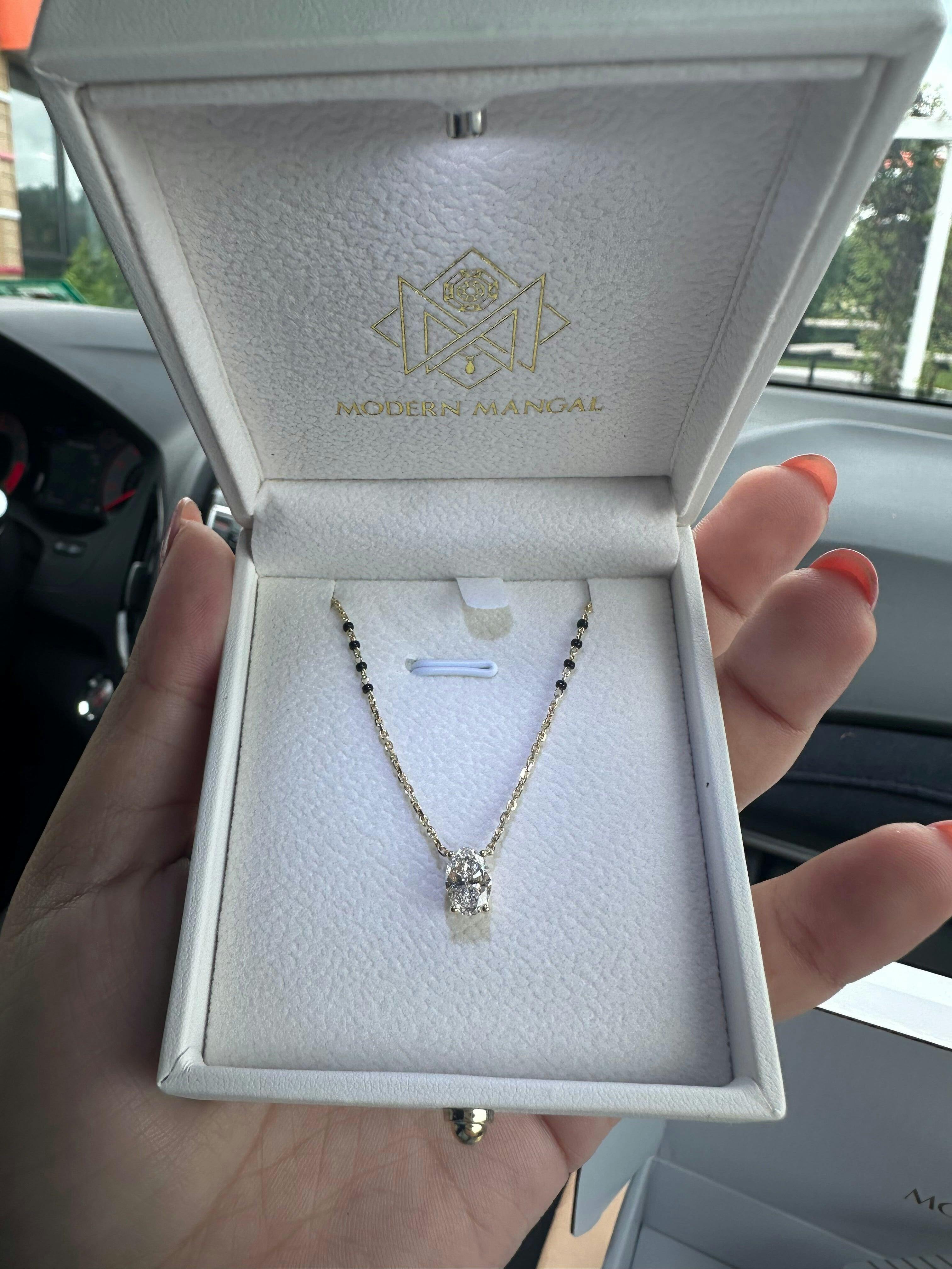Introducing the Ami Mangalsutra, where classic tradition meets refined modernity. This piece captivates with a vertically set brilliant oval certified lab-grown diamond, expertly secured within a fixed pendant. Available in a variety of diamond sizes and grades.