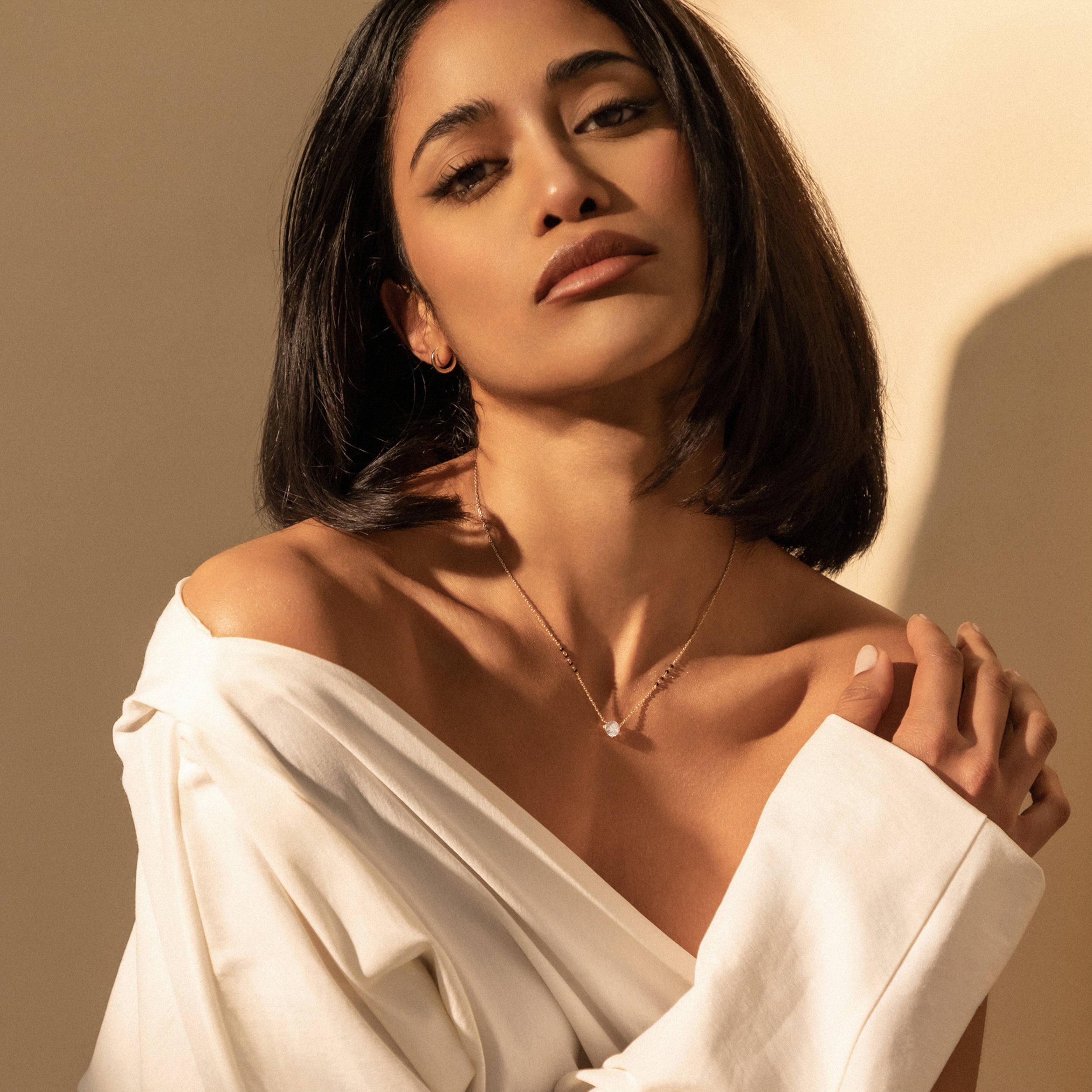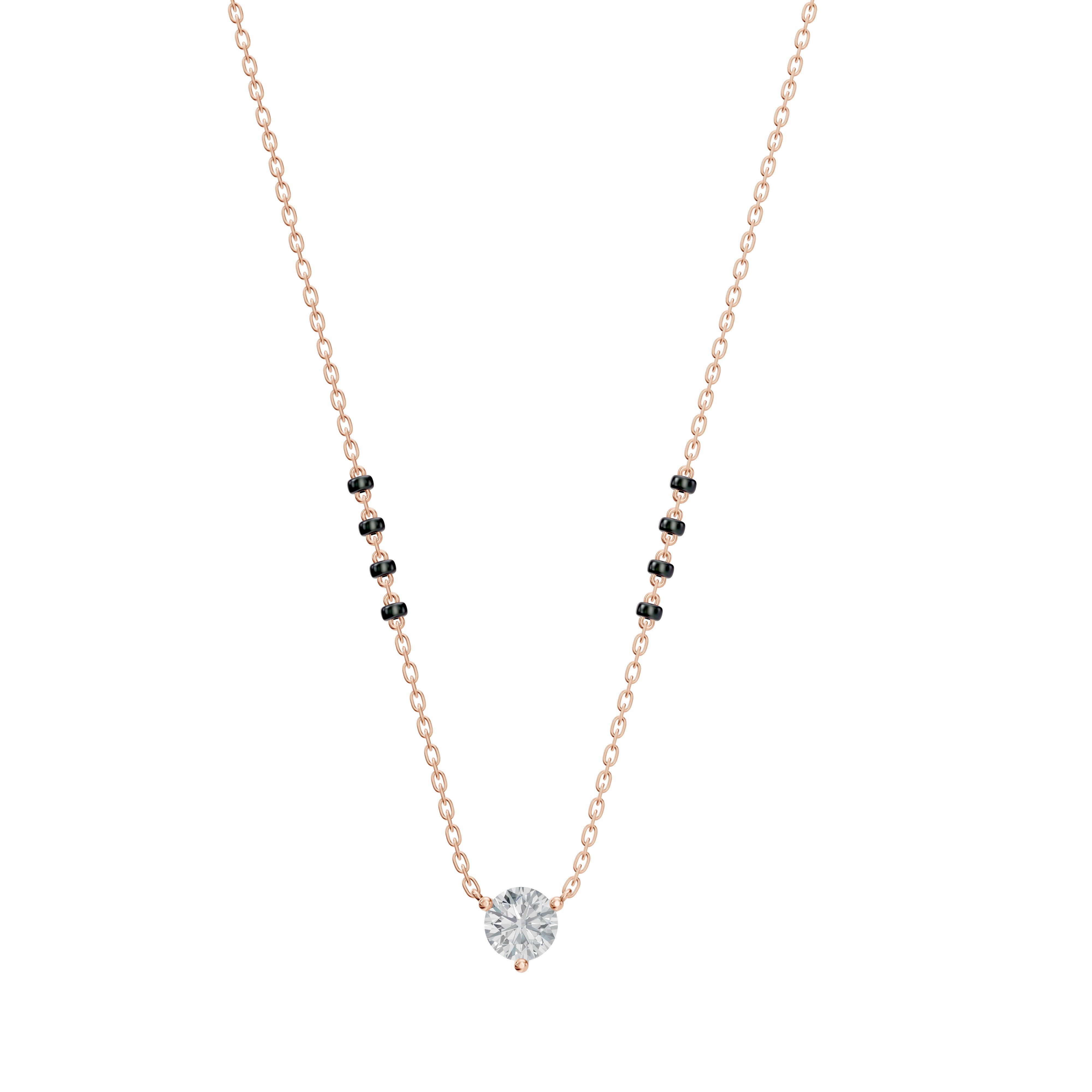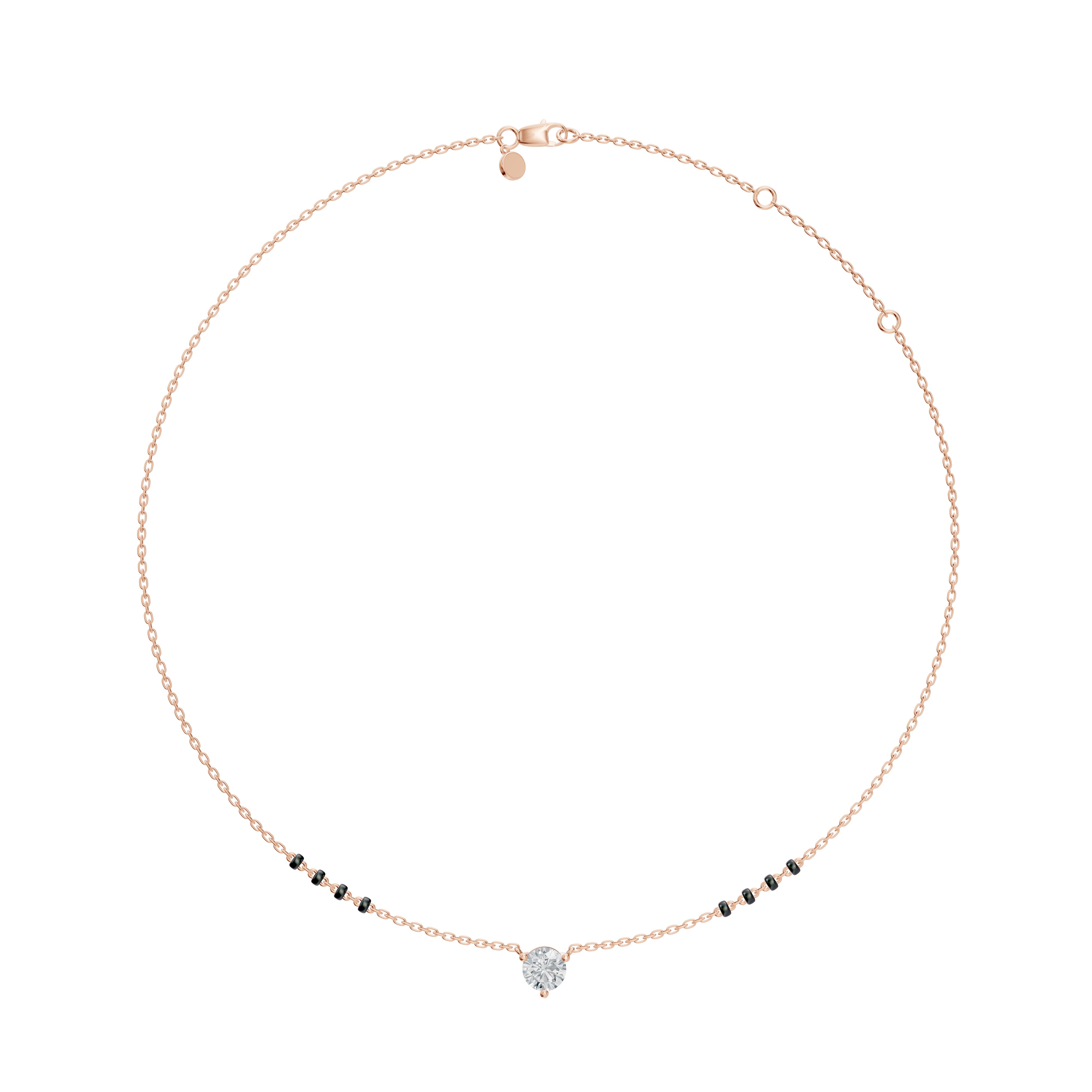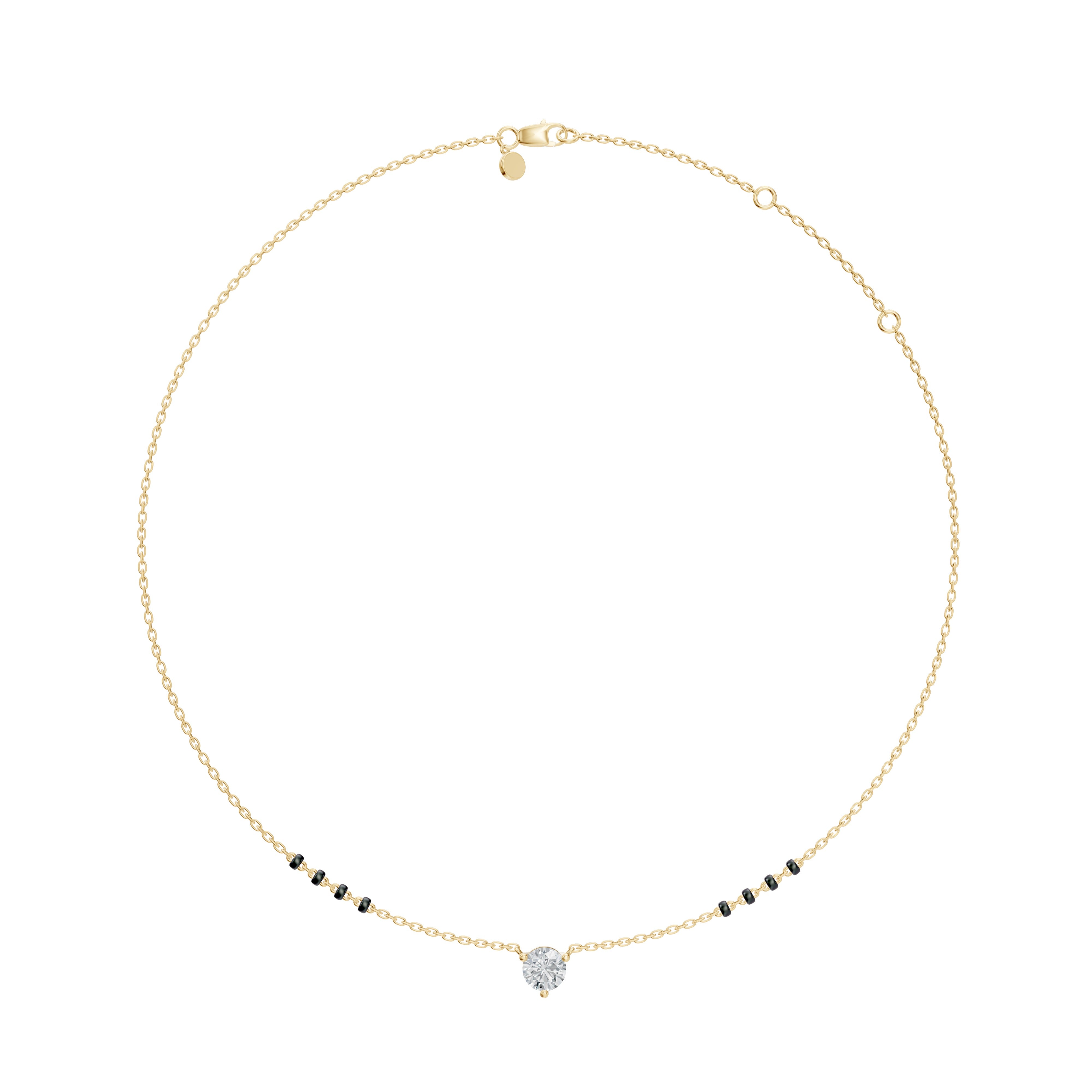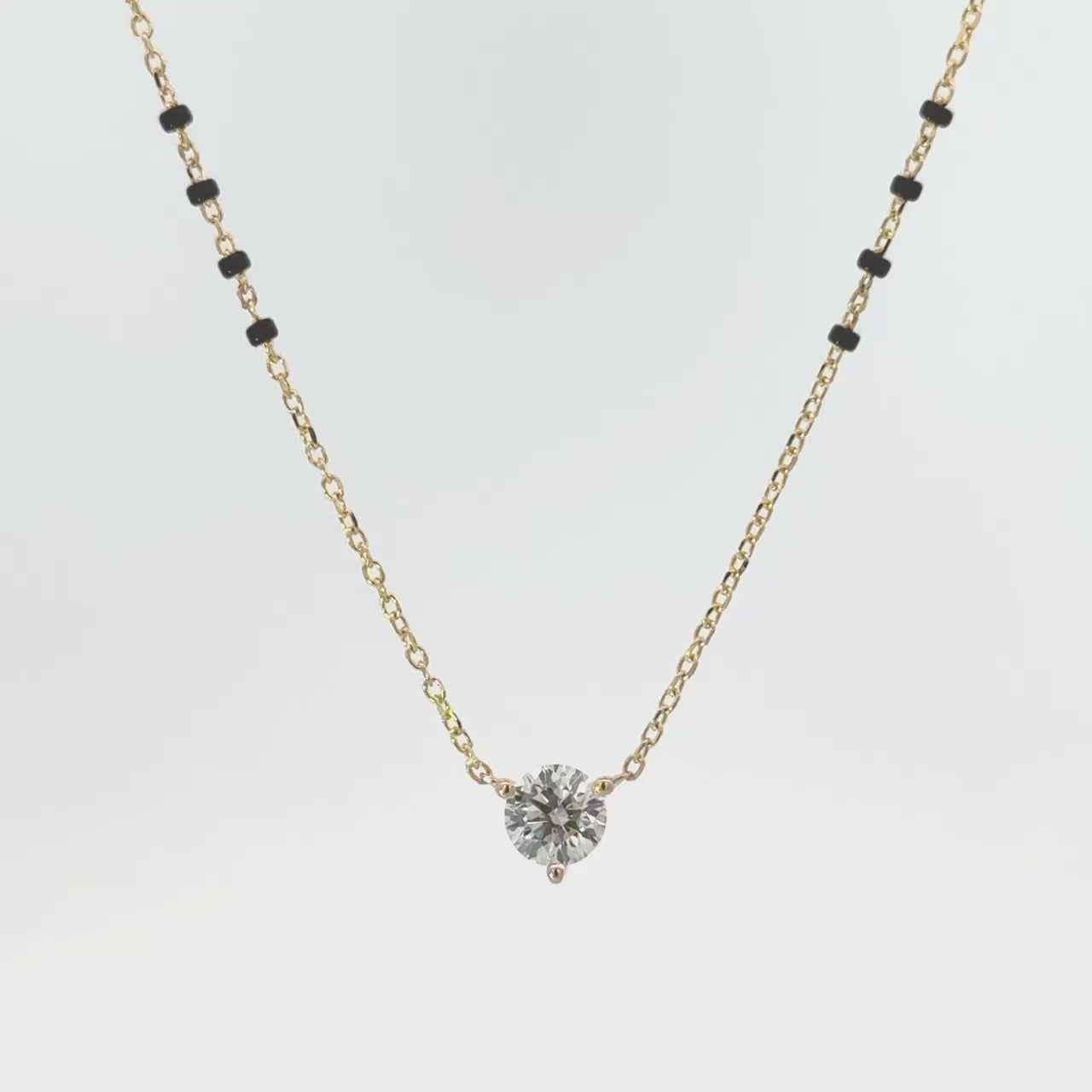 Unveil your unique style with the Anahi Mangalsutra, a masterful fusion of heritage and modern grace. This stunning piece centers around a brilliant round certified lab-grown diamond, meticulously set in a fixed pendant that captures attention with its sparkling allure.