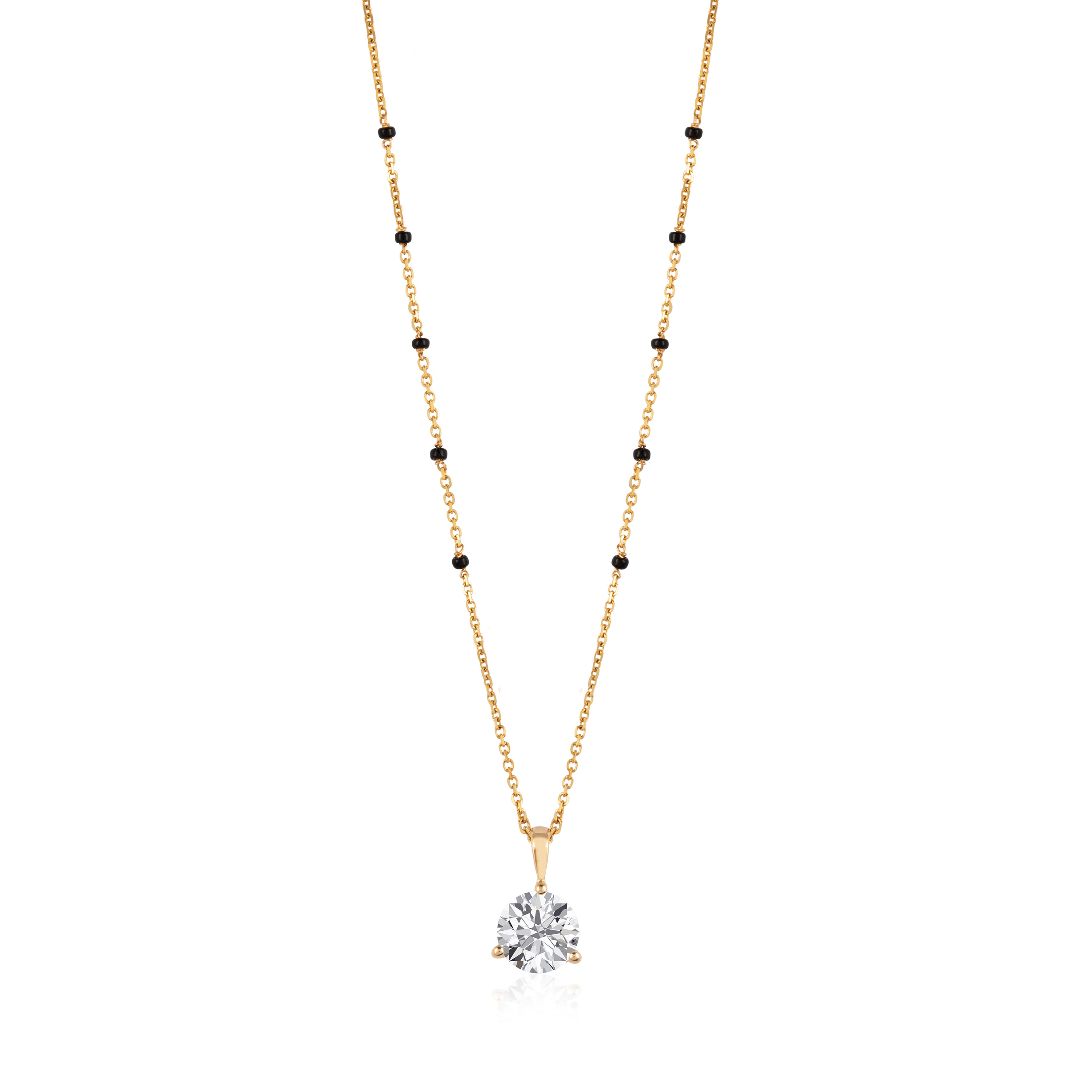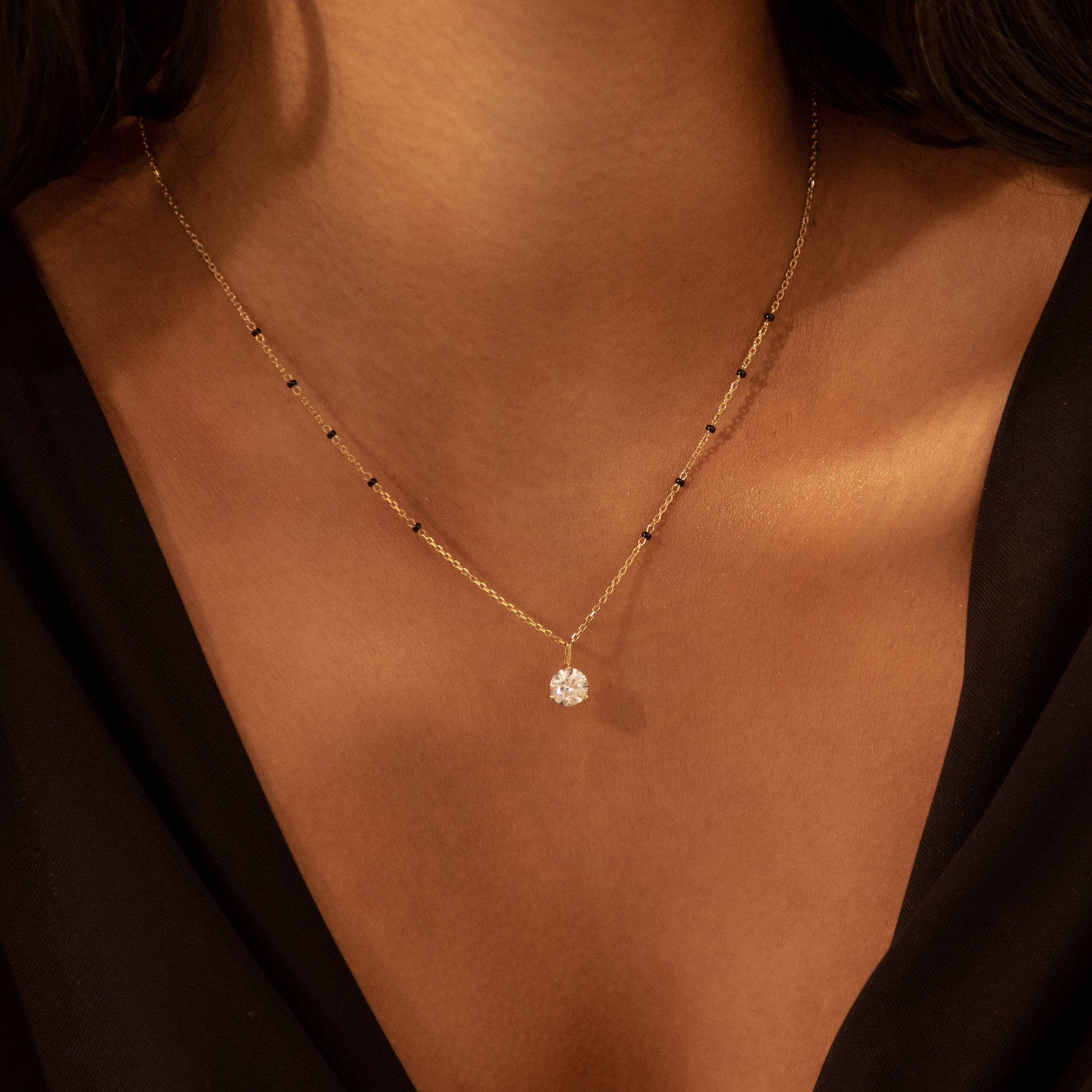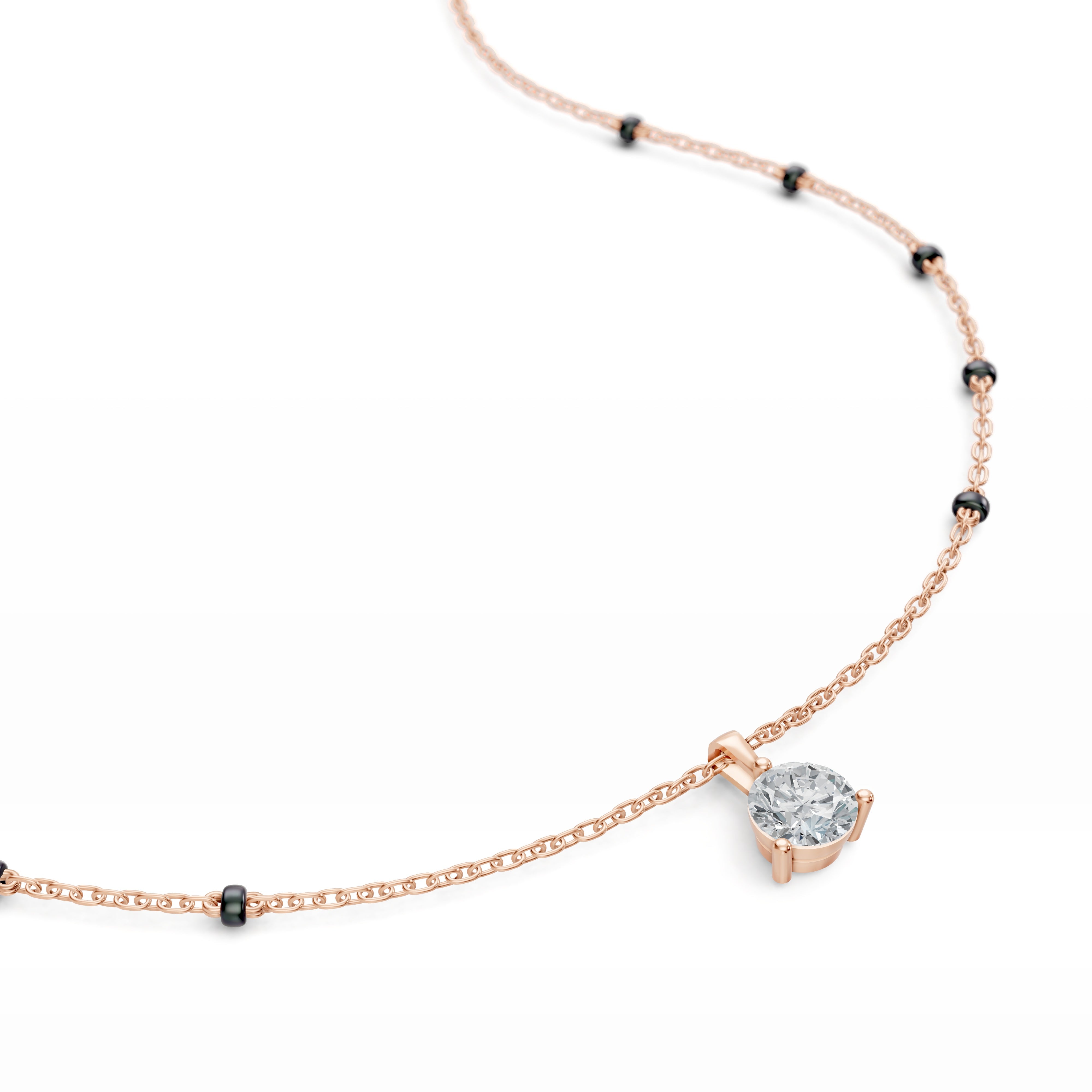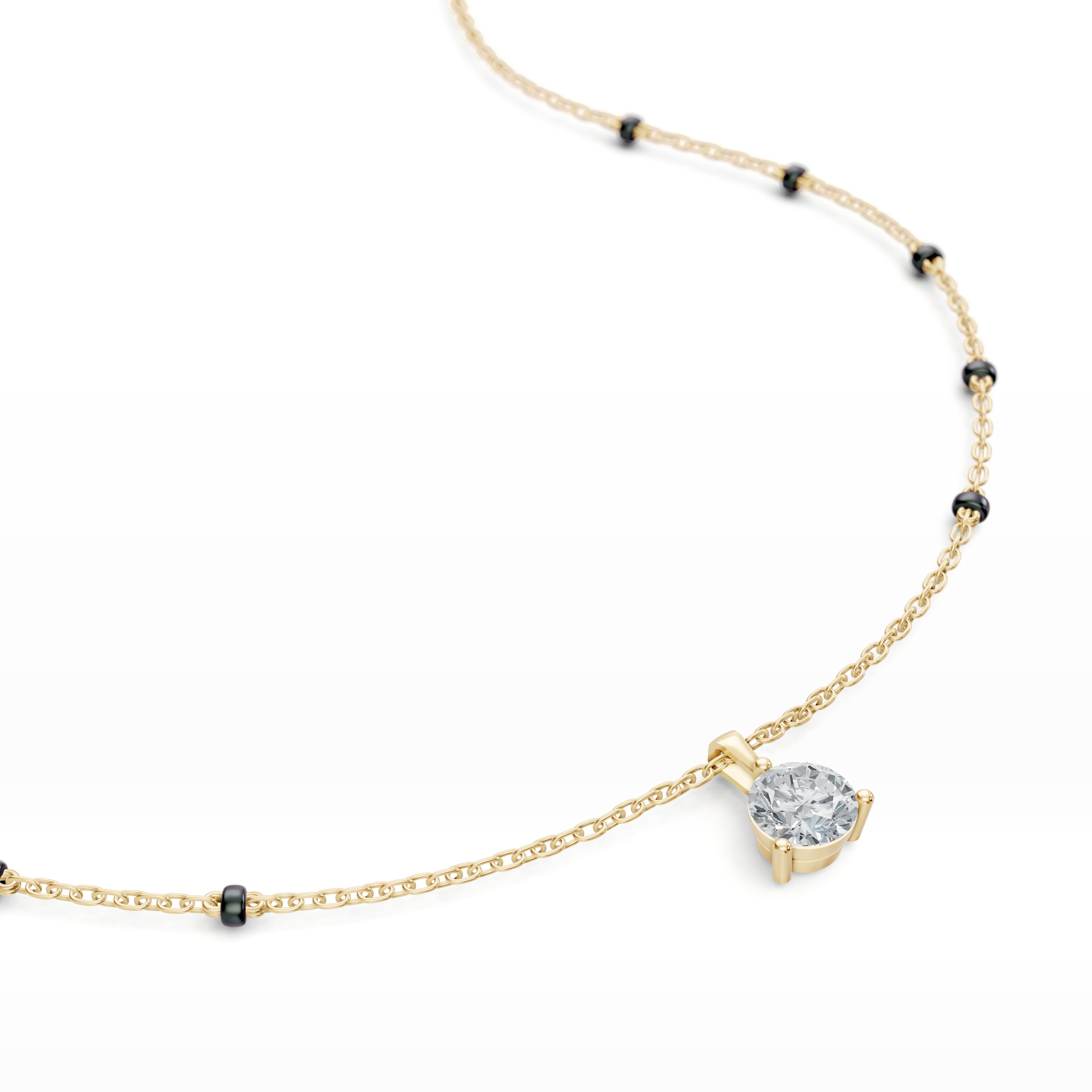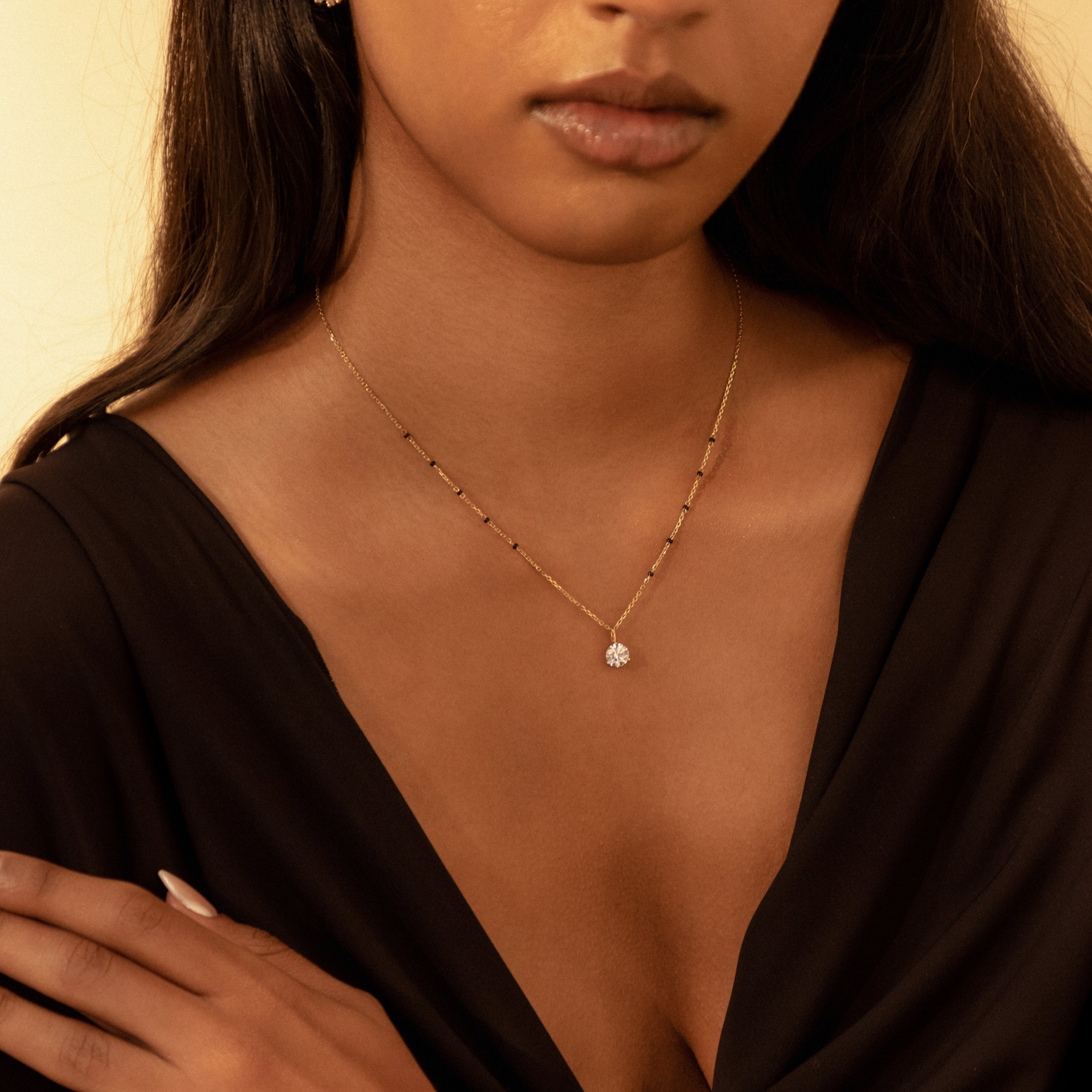 Step up your style game with the Malini Mangalsutra, where classic tradition meets sleek modern design. This piece features a round brilliant certified lab-grown diamond, available in various carat sizes and grades, set in a versatile bail pendant for effortless customization.