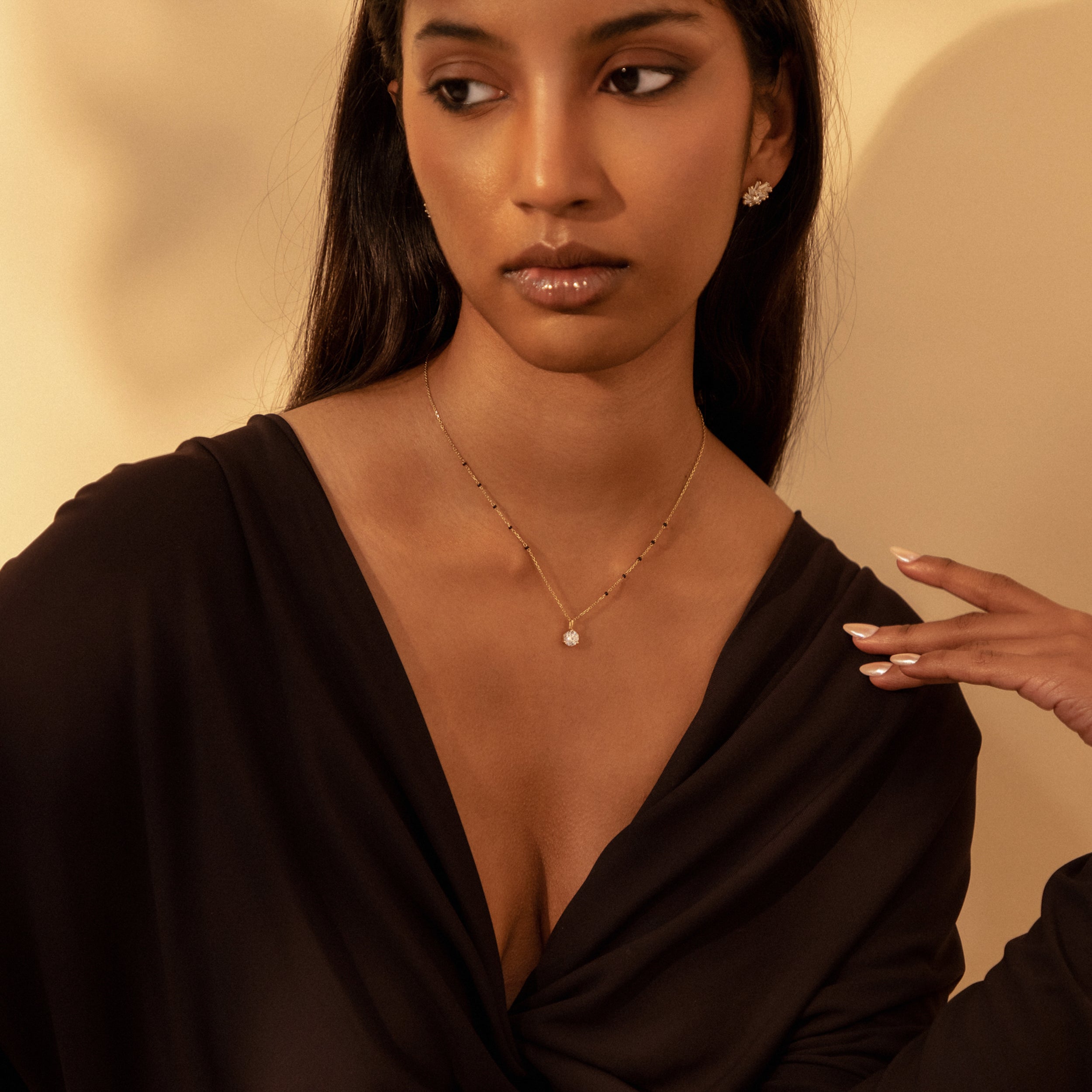 Available in 18k gold options of yellow, white, or rose, the Malini Mangalsutra is accented with five precisely spaced black beads on each side, adding a touch of tradition with a contemporary twist.