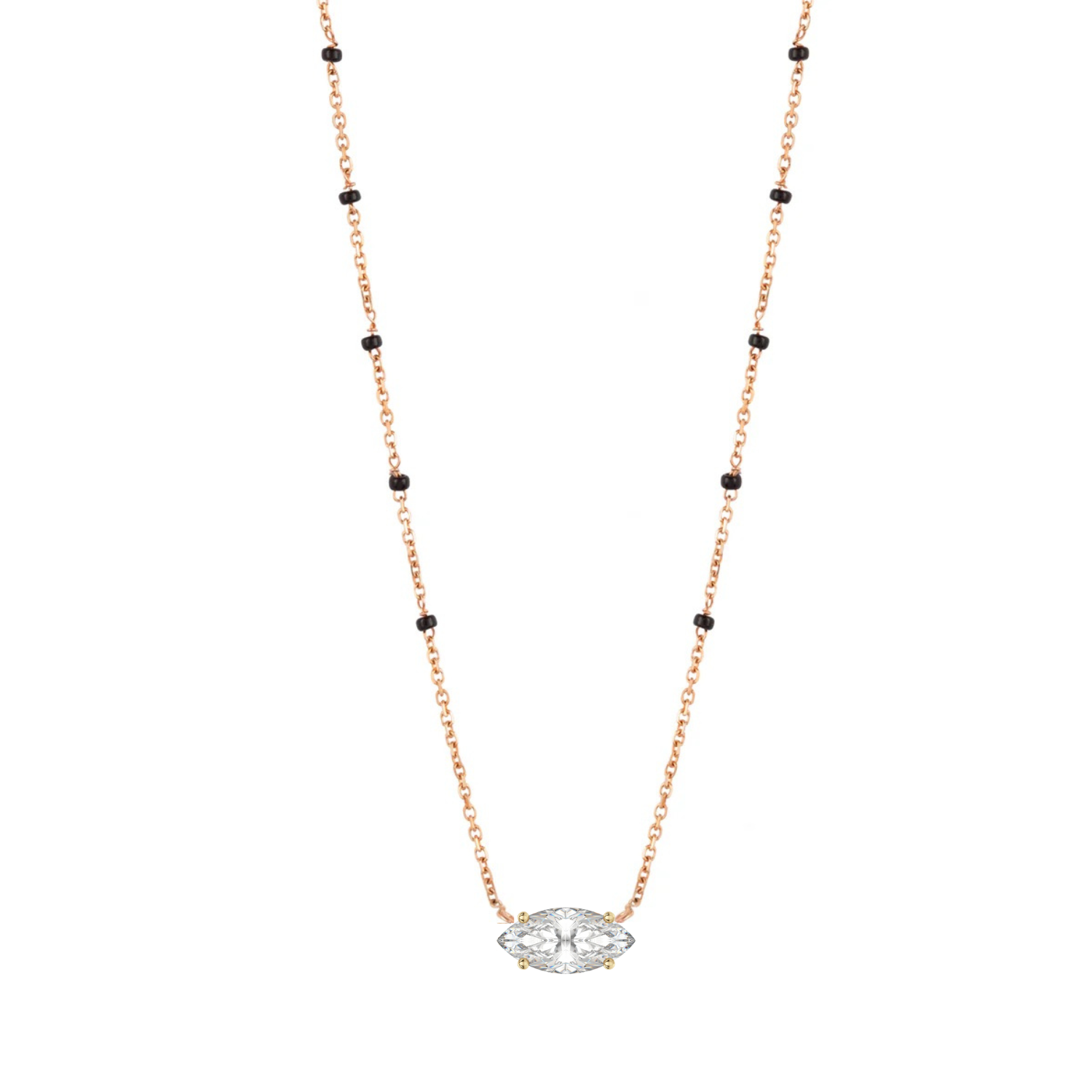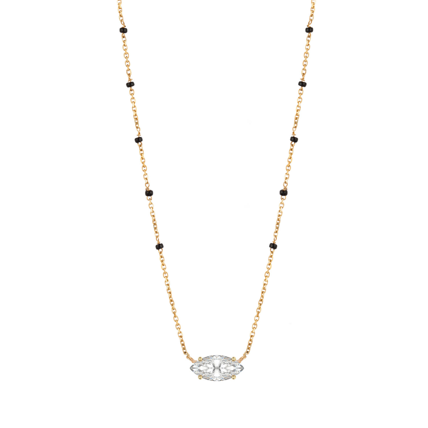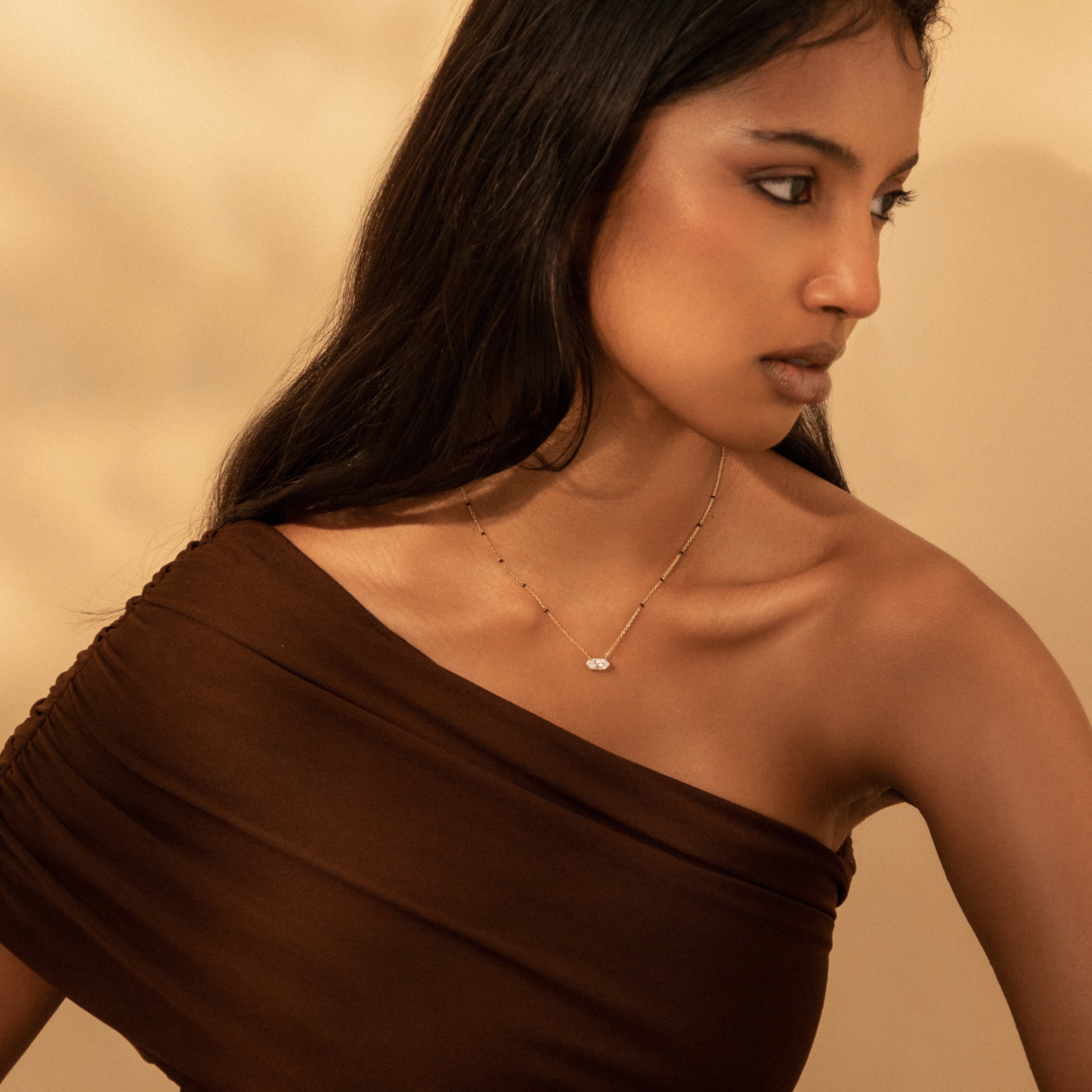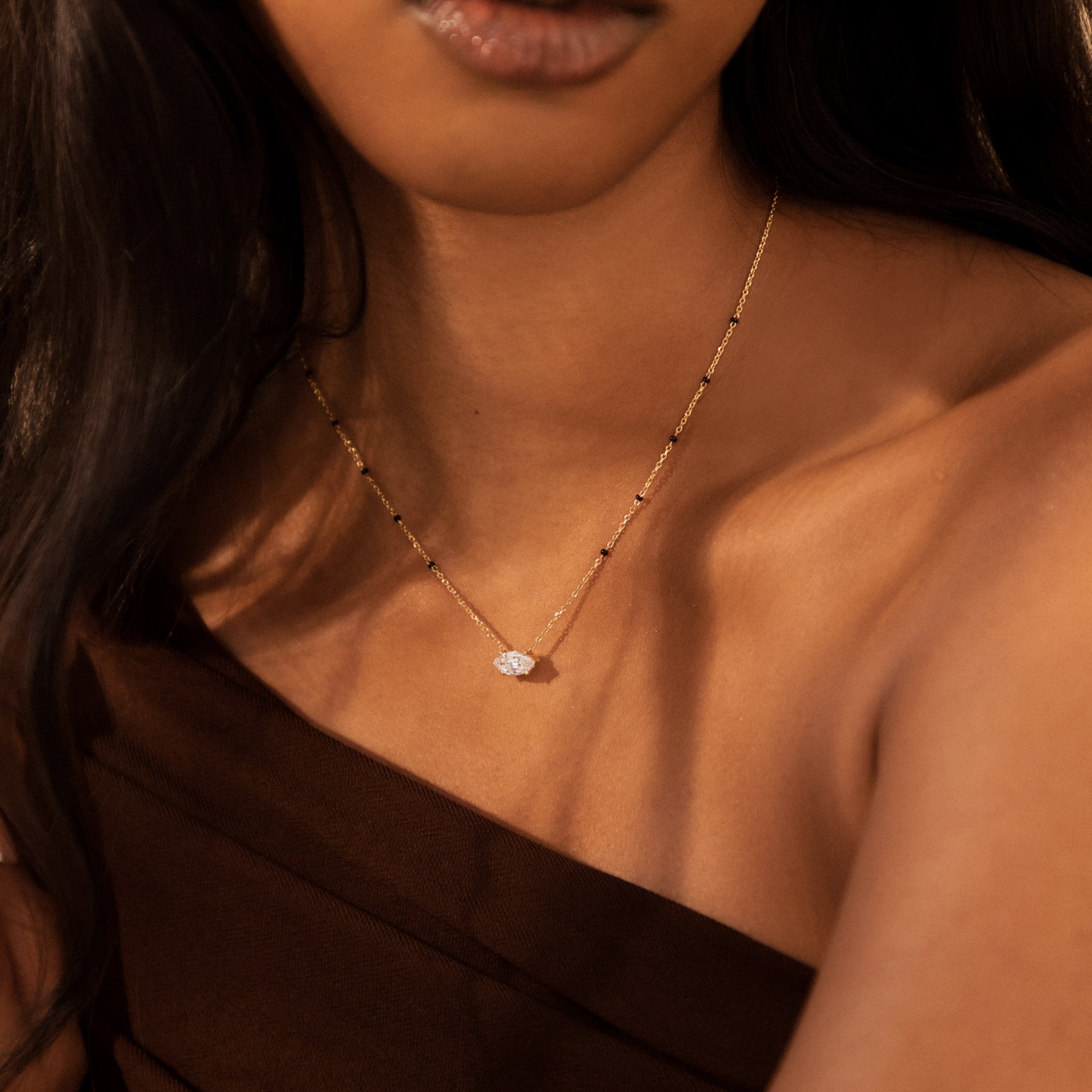 Unveiling the Myra Mangalsutra, an exquisite reimagining of sacred tradition for the modern bride. Derived from Sanskrit meaning "extraordinary," this statement piece features an east-west set marquise lab-grown diamond—its "navika" or boat-shaped silhouette symbolizing the vessel that carries two souls together through life's journey.