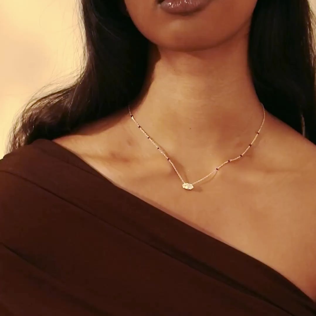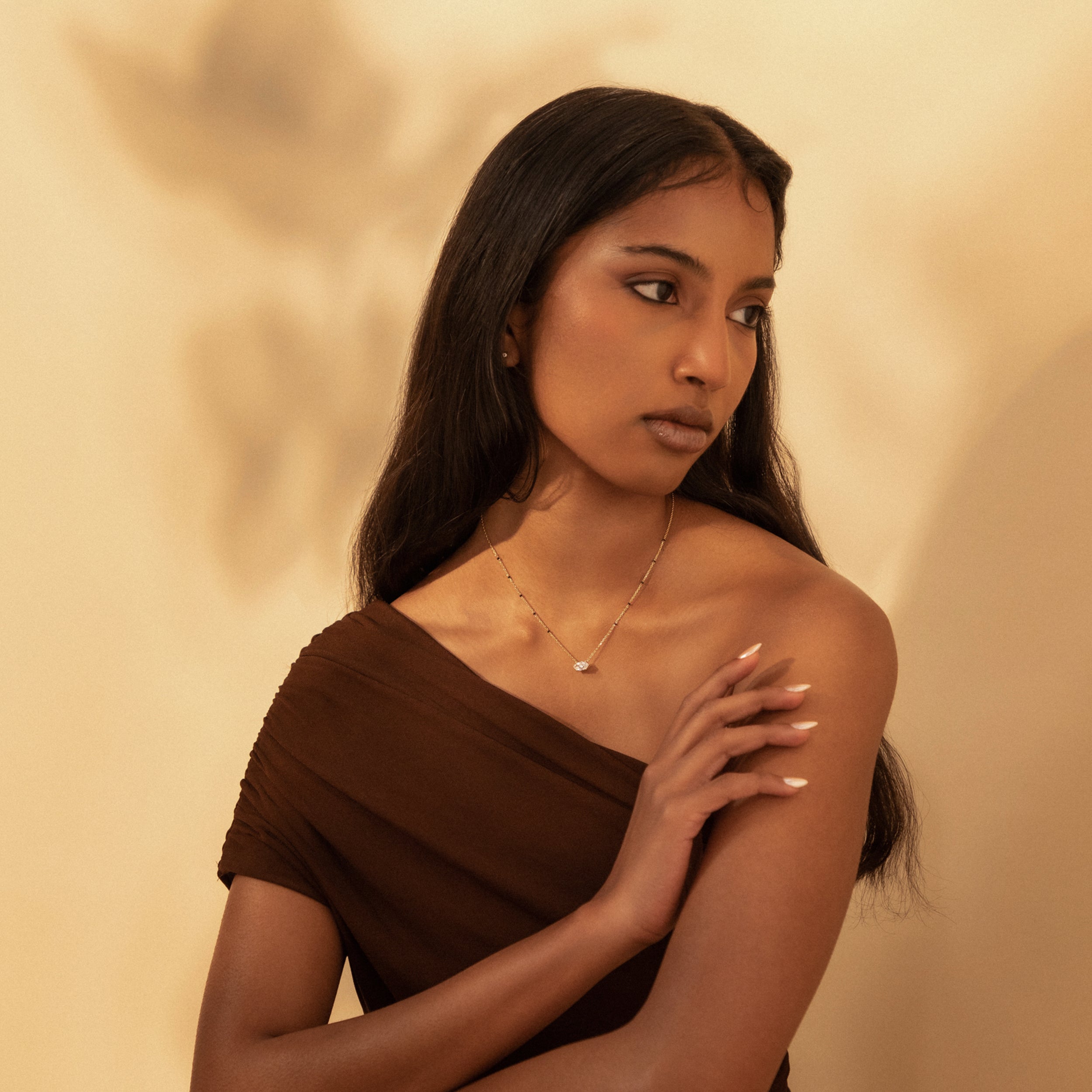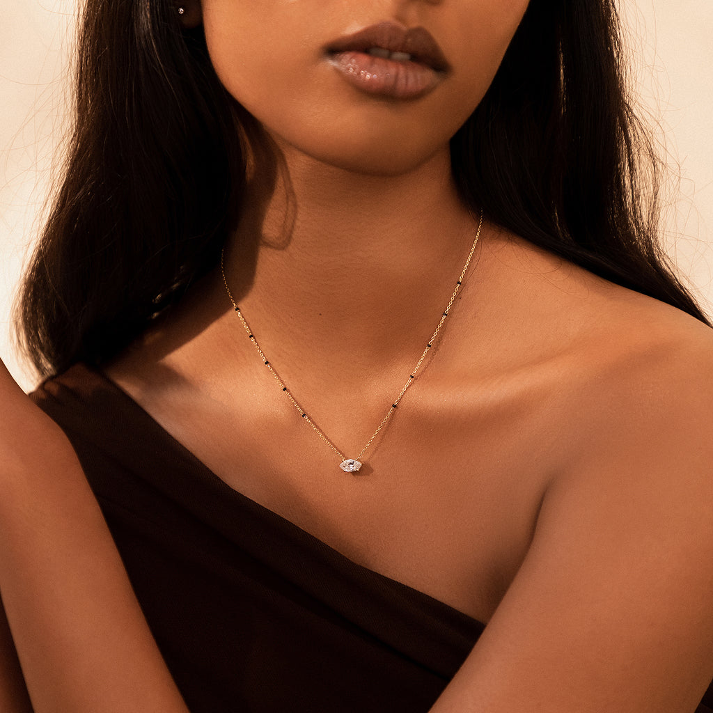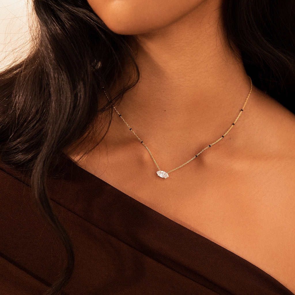 Unveiling the Myra Mangalsutra, an exquisite reimagining of sacred tradition for the modern bride. Derived from Sanskrit meaning "extraordinary," this statement piece features an east-west set marquise lab-grown diamond—its "navika" or boat-shaped silhouette symbolizing the vessel that carries two souls together through life's journey.