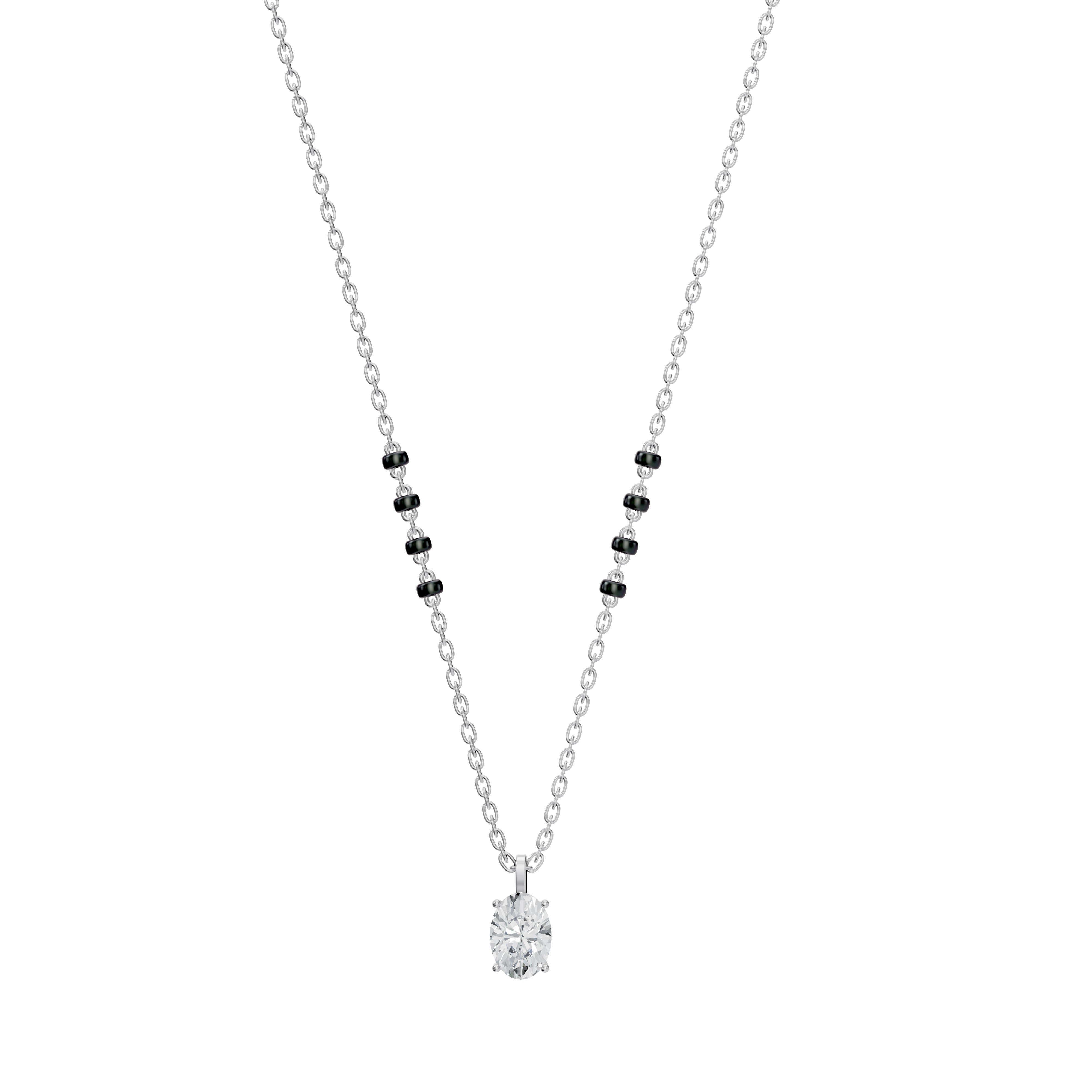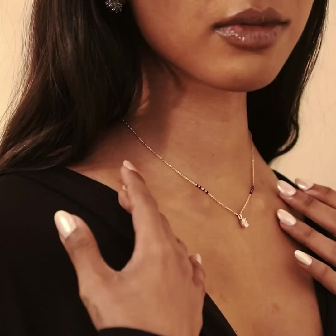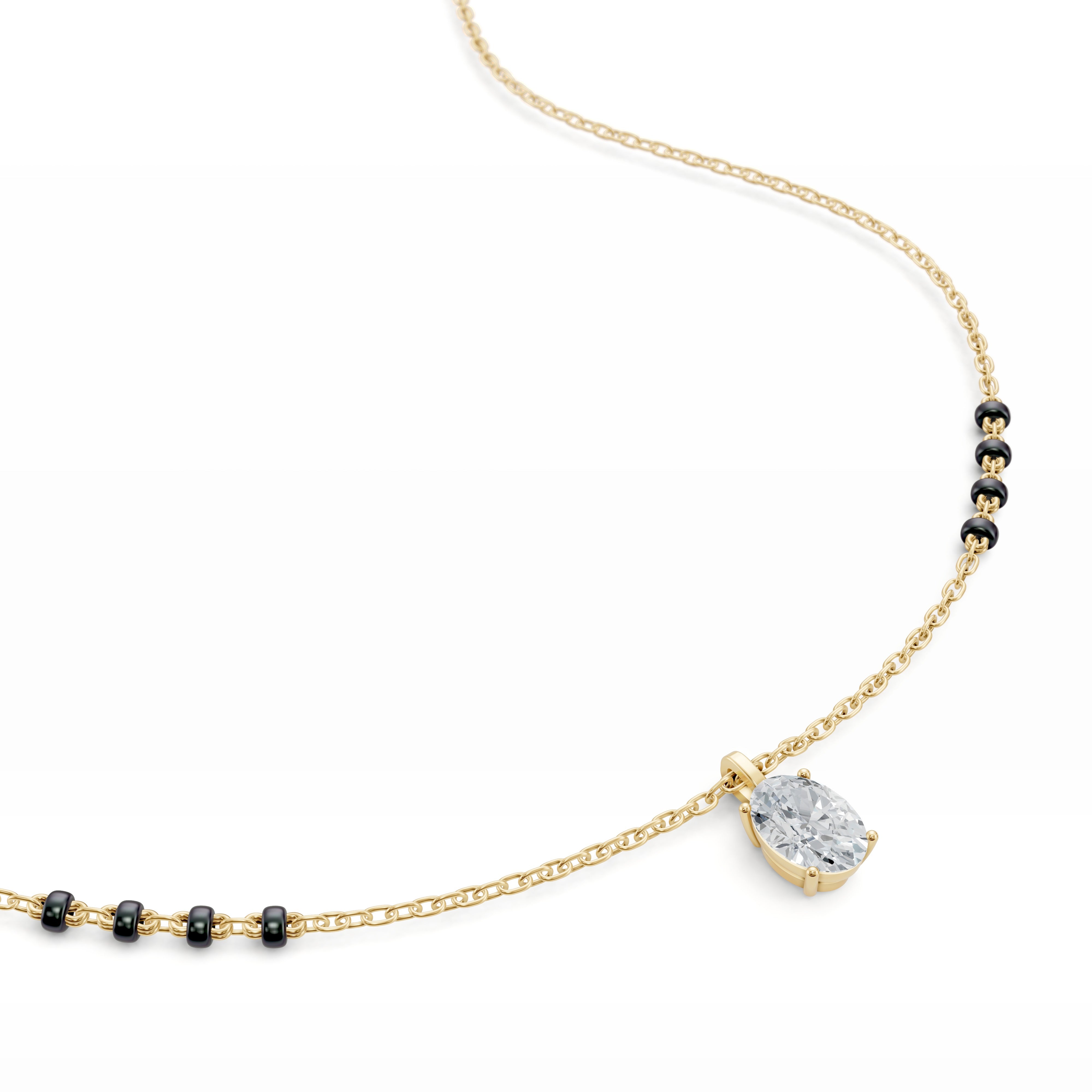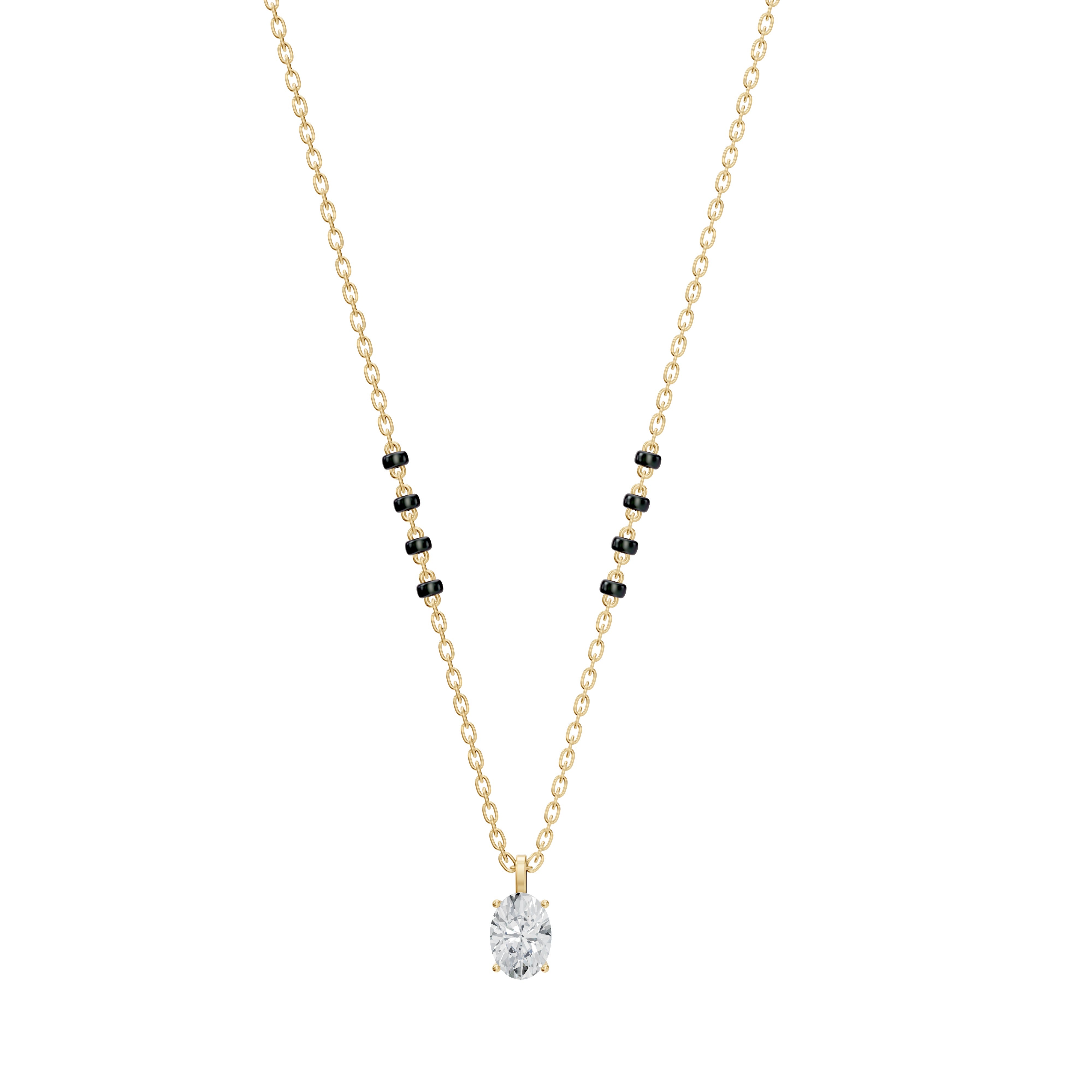 Unveil your unique style with the Nimi Mangalsutra, where classic tradition meets sleek modernity. This standout piece features a stunning vertically-set oval lab-grown diamond, available in various sizes and grades, showcased within a sleek bail pendant for easy customization.