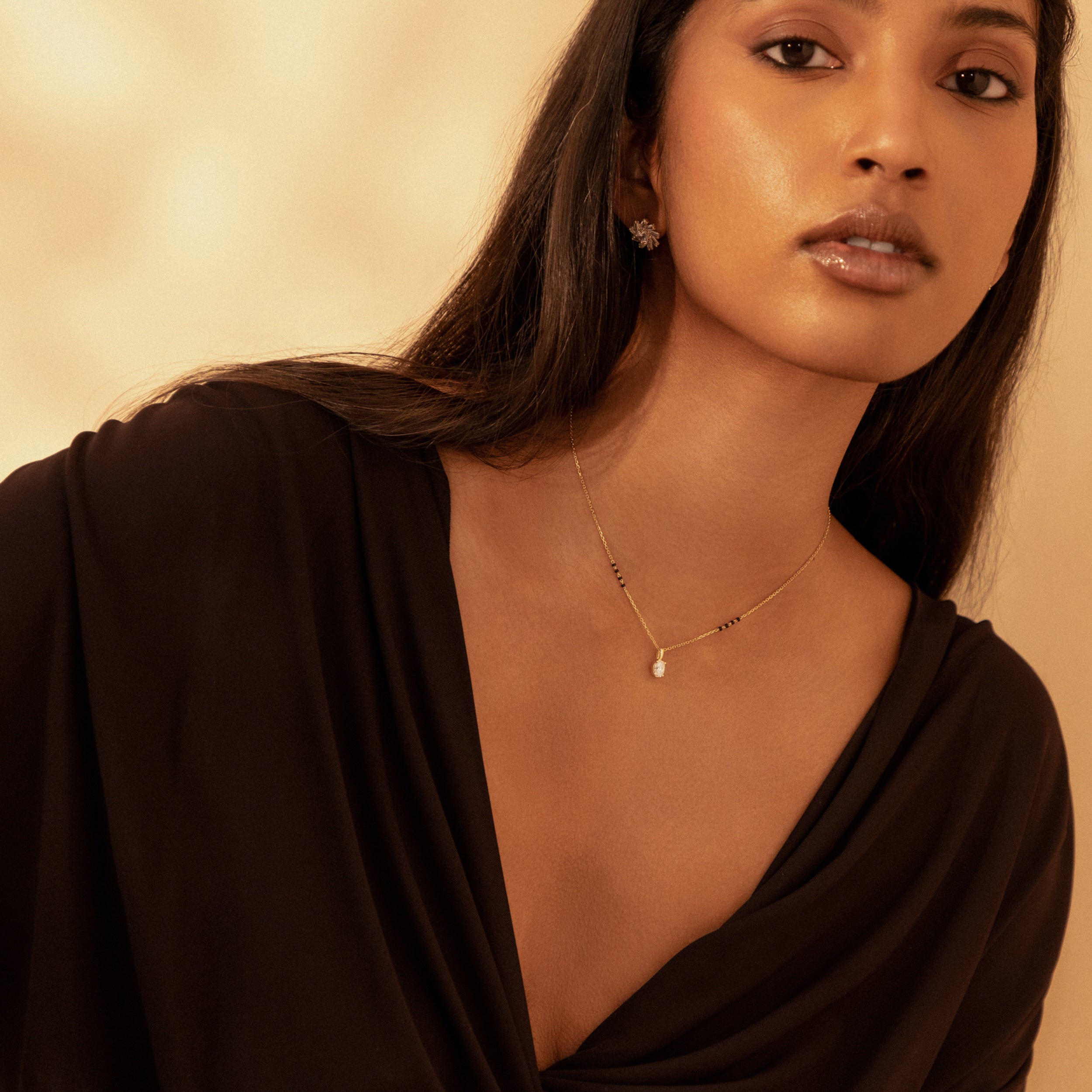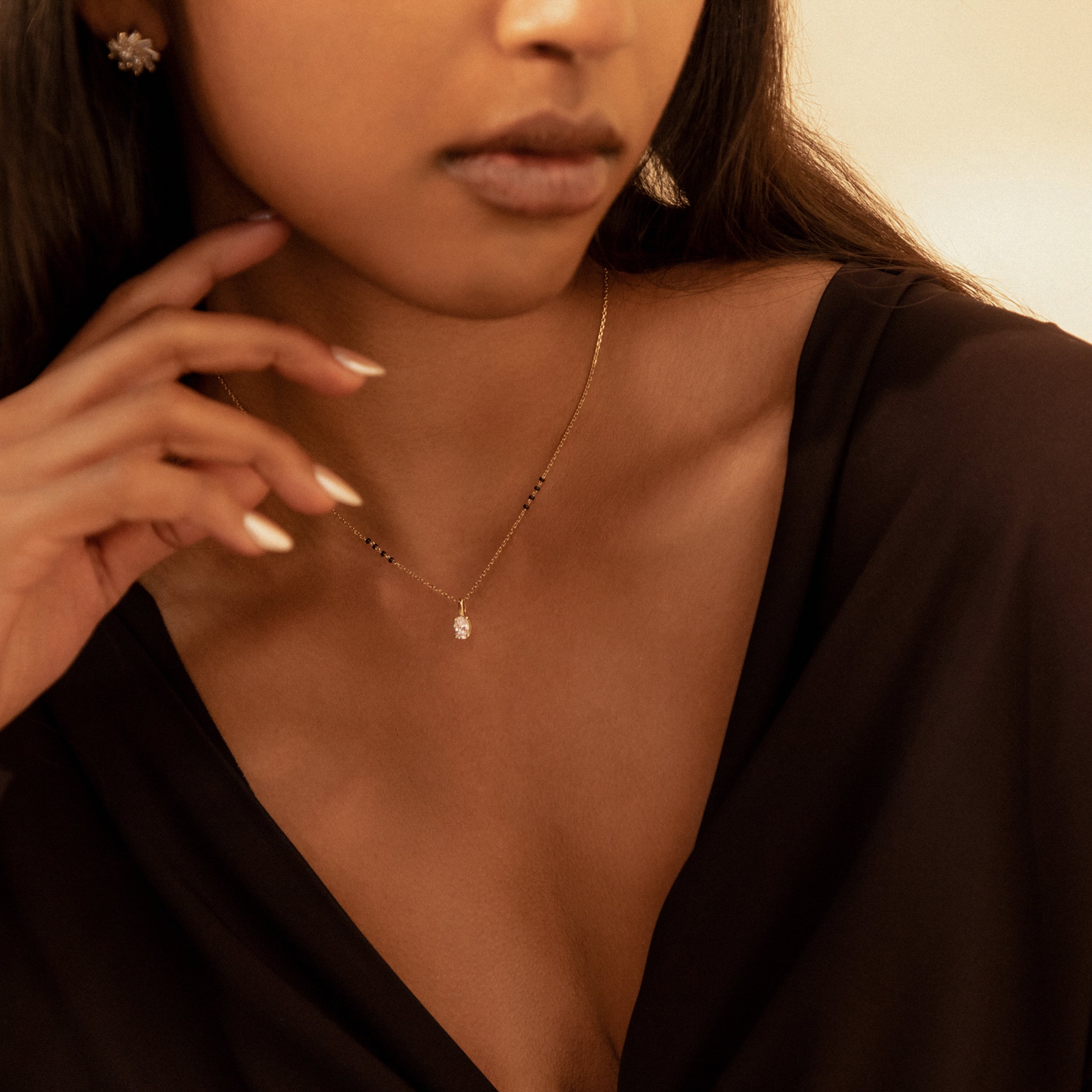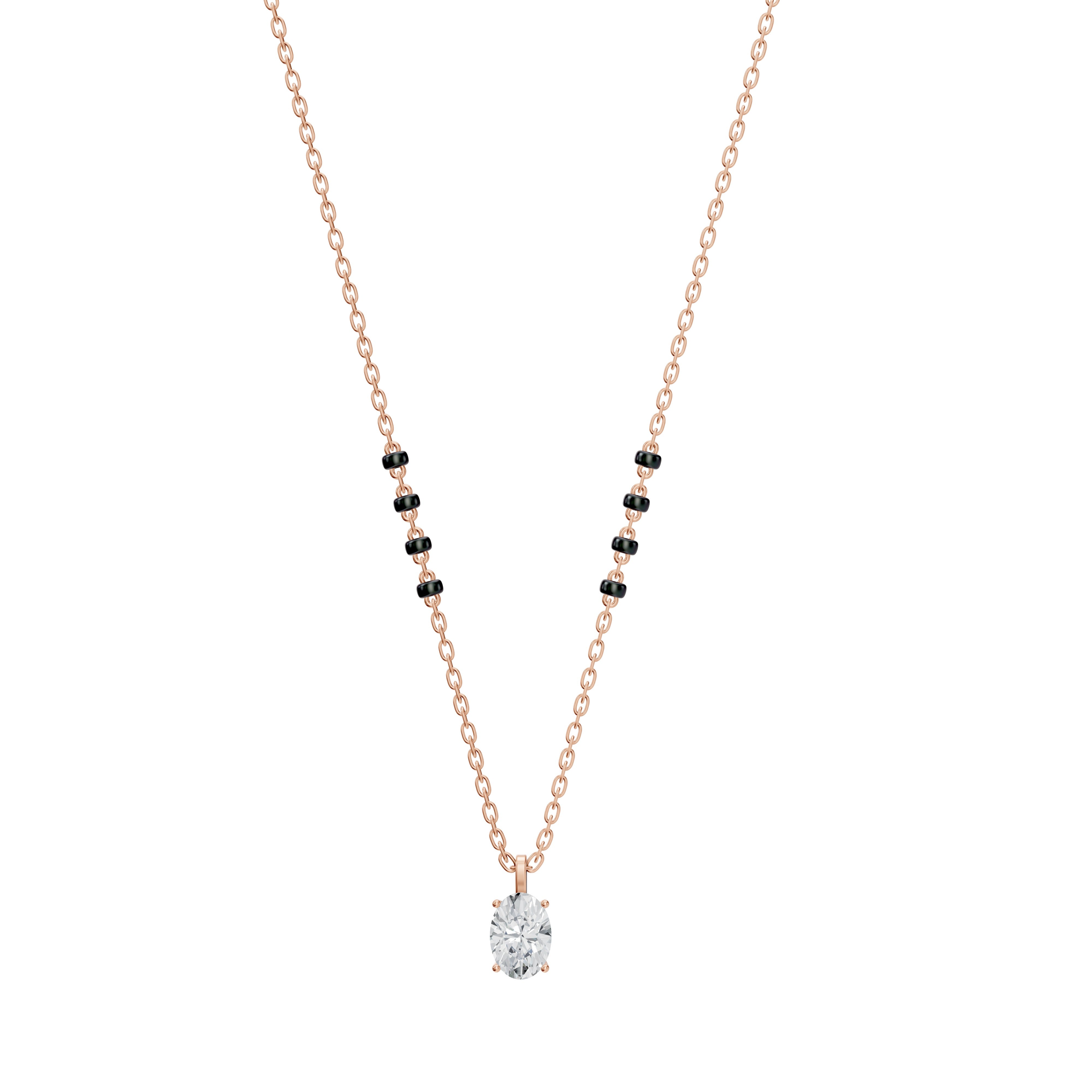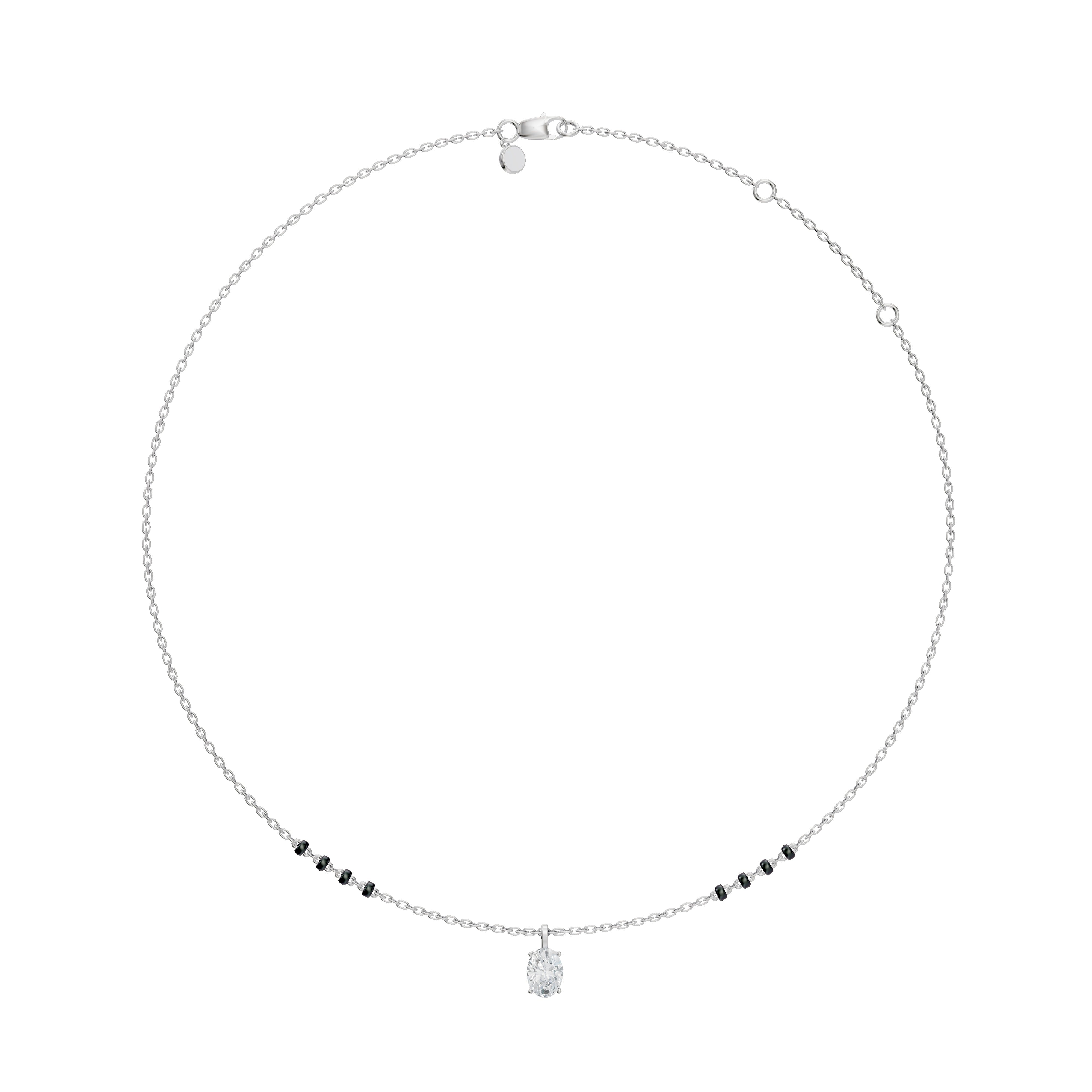 Unveil your unique style with the Nimi Mangalsutra, where classic tradition meets sleek modernity. This standout piece features a stunning vertically-set oval lab-grown diamond, available in various sizes and grades, showcased within a sleek bail pendant for easy customization.