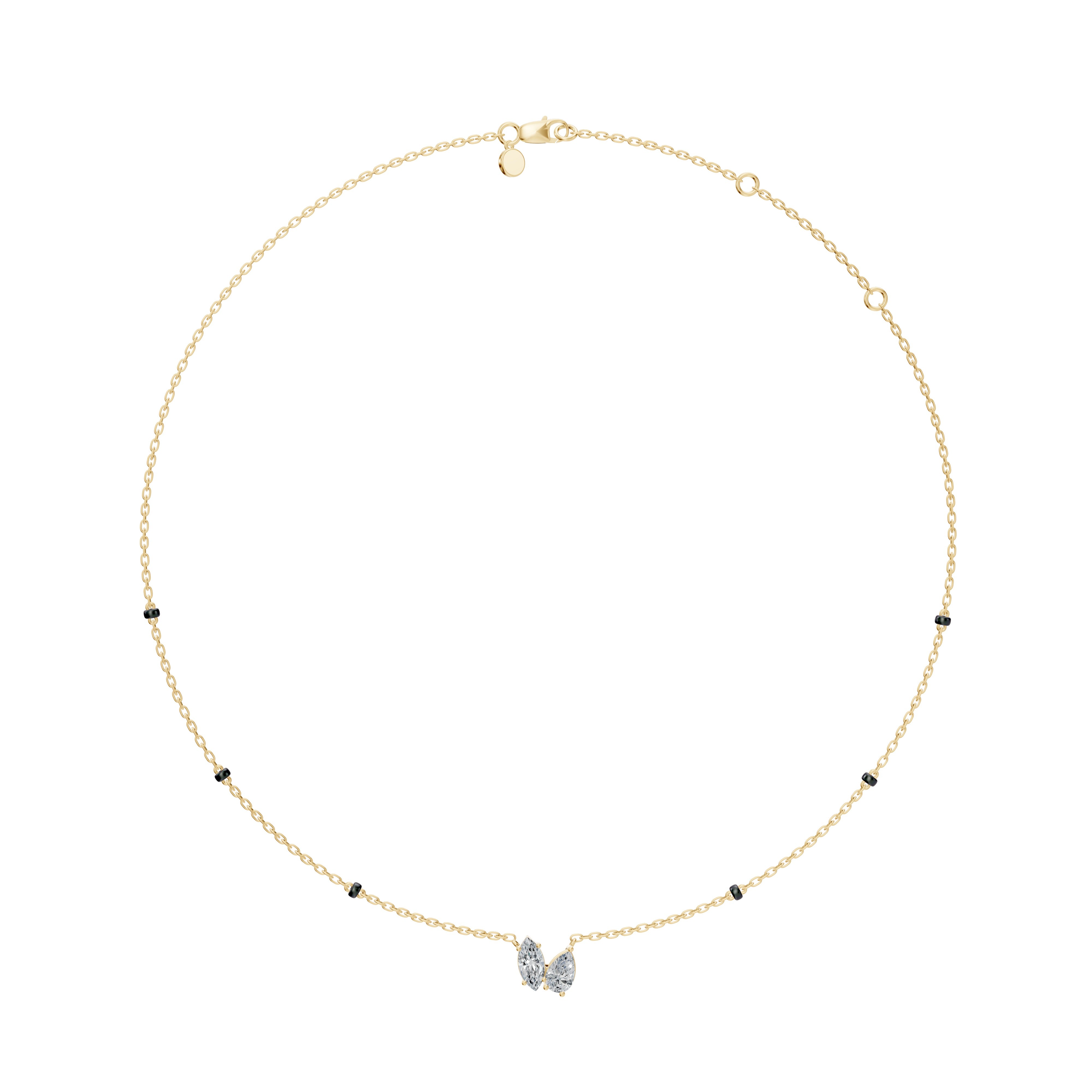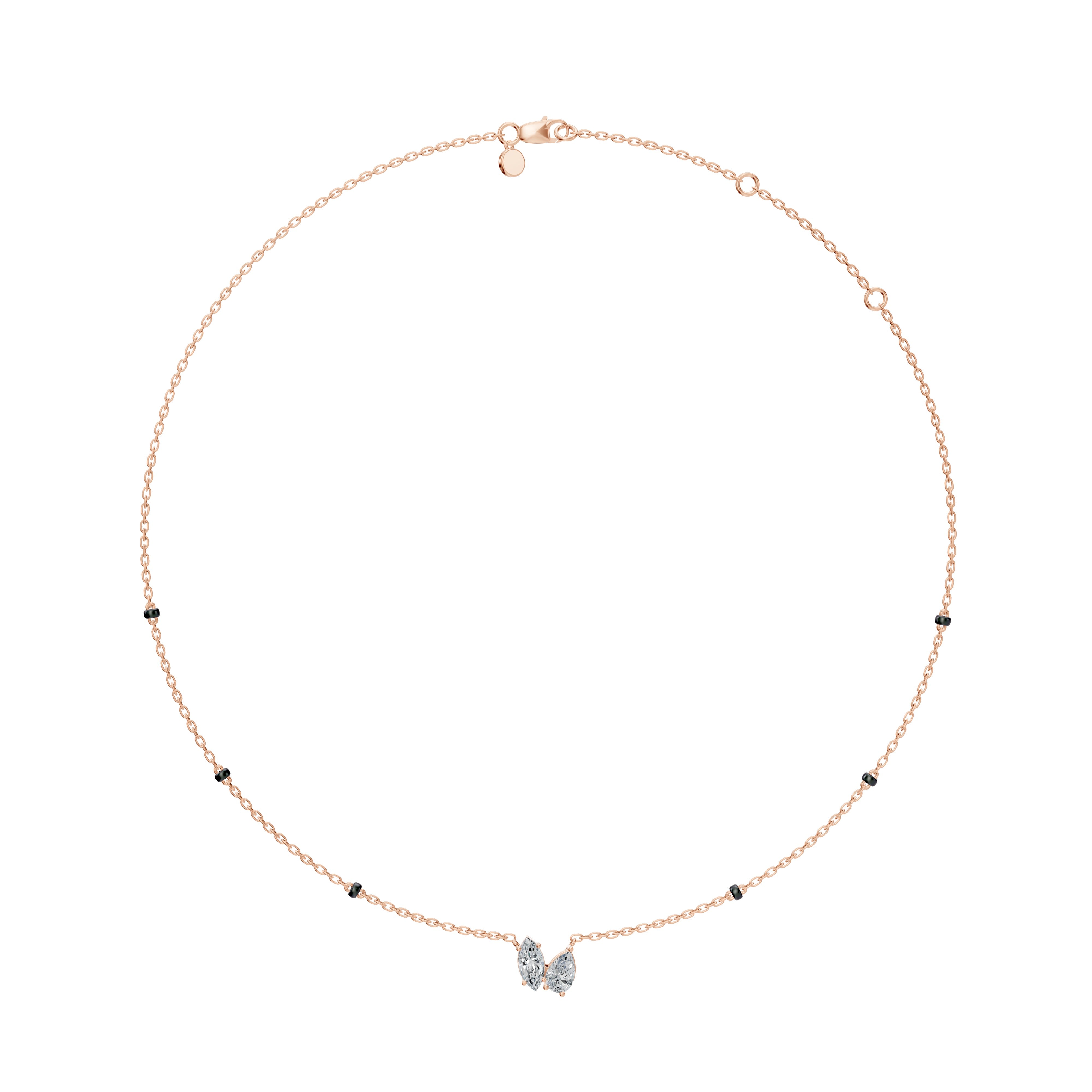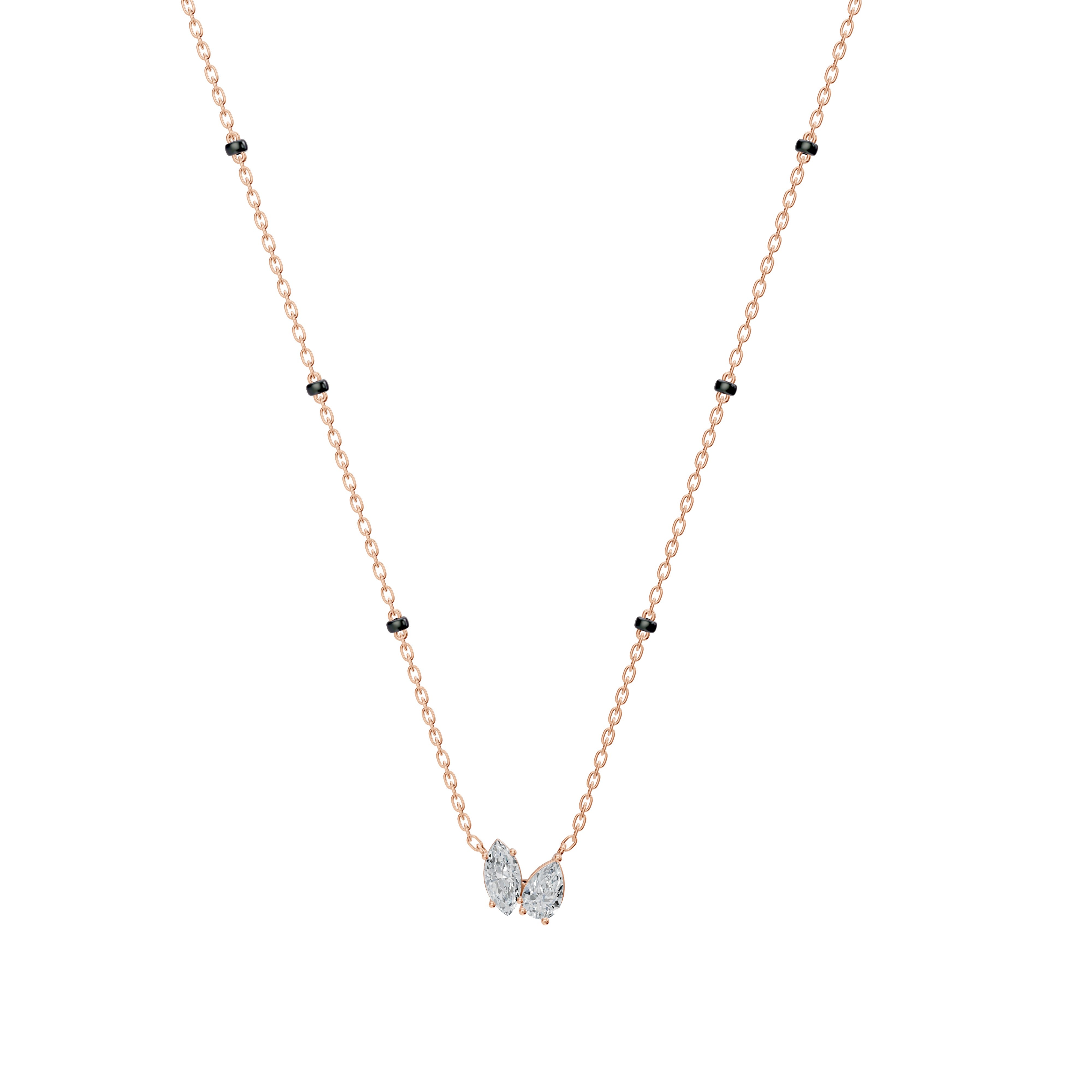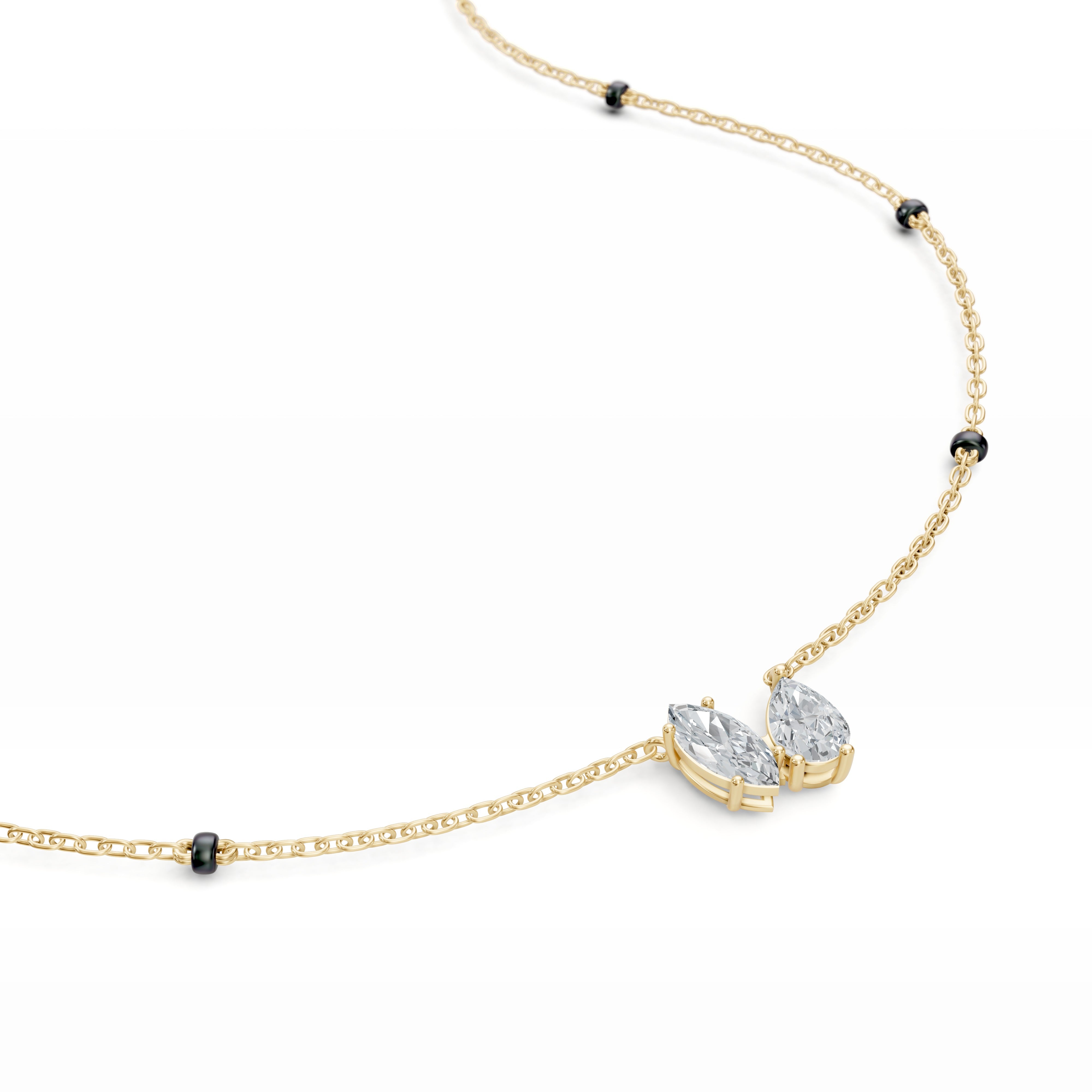 The Seema Mangalsutra, inspired by the love story of Seema and Sohum, features a captivating pear and marquise diamond pairing that beautifully symbolizes the unity of two souls. This exquisite toi-et-moi design perfectly embodies the essence of togetherness.
