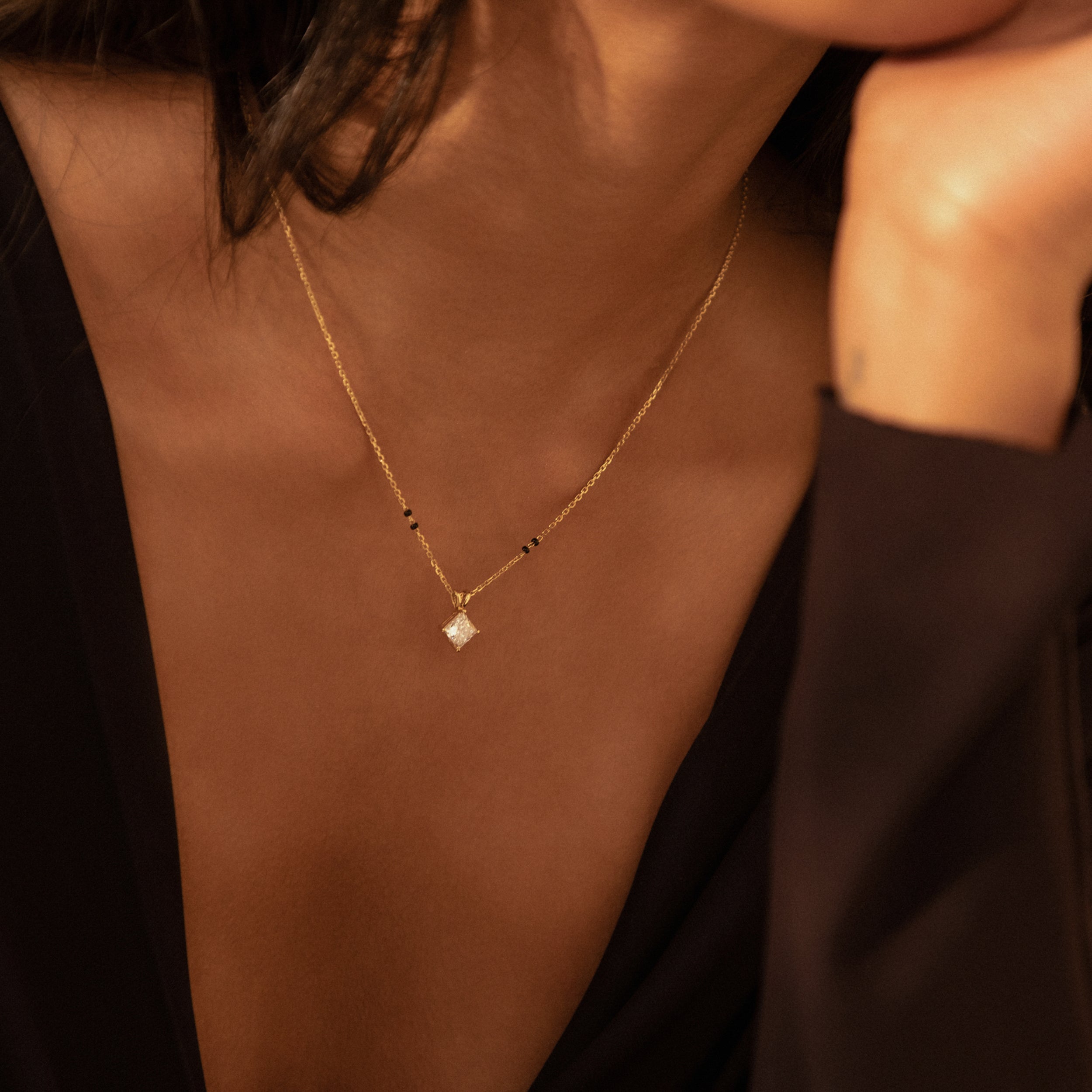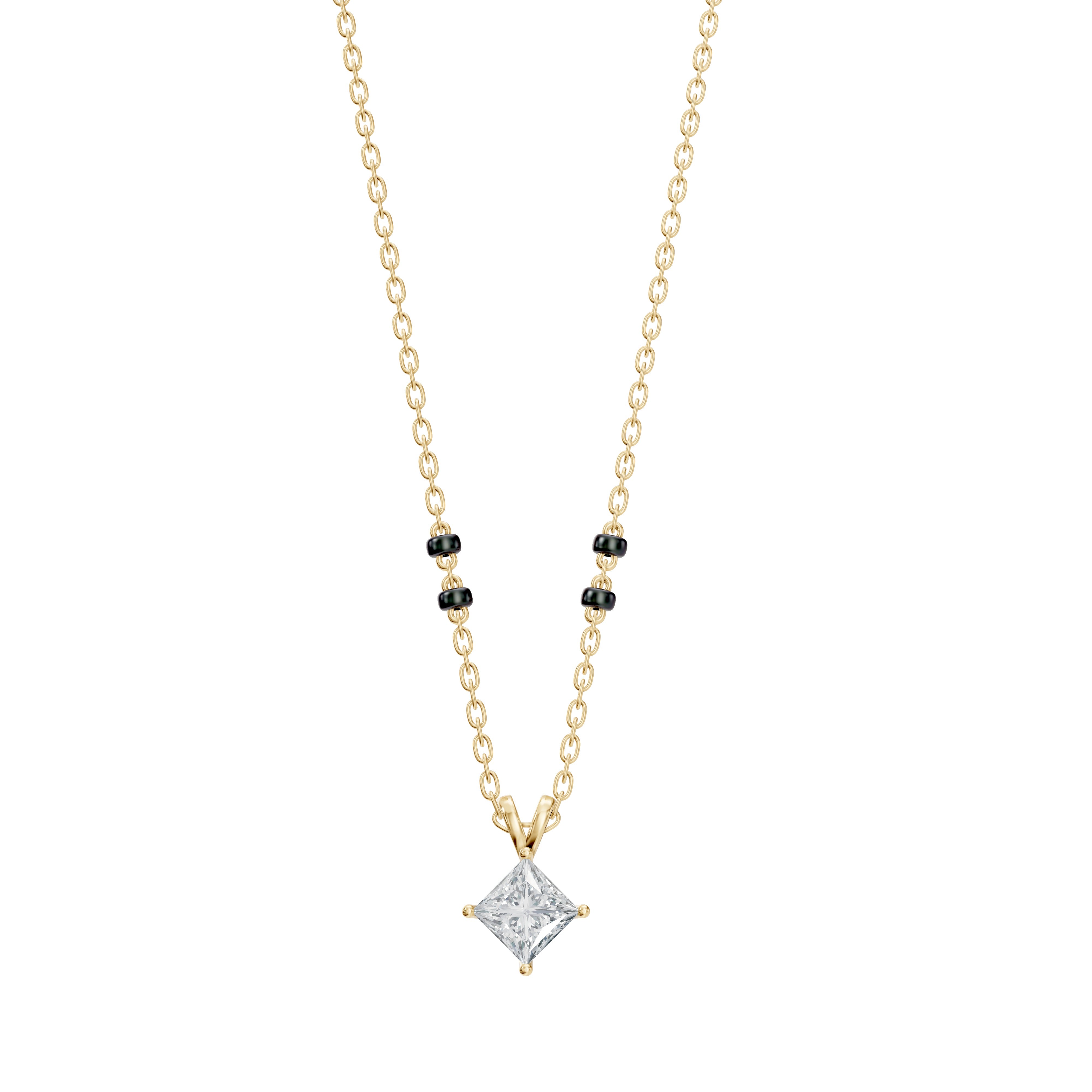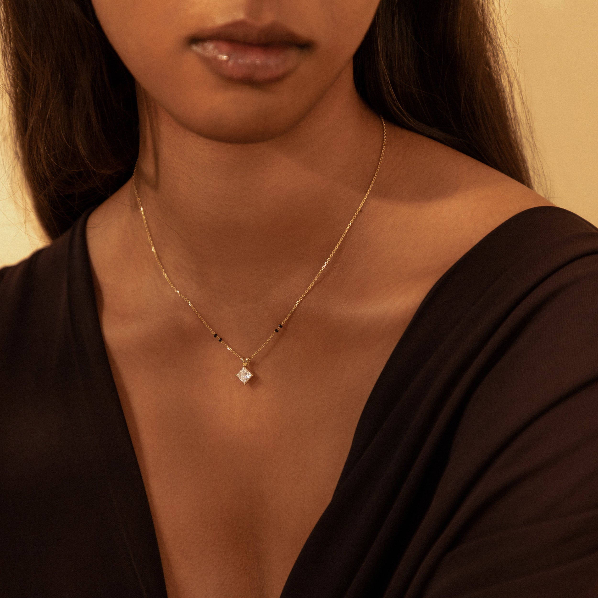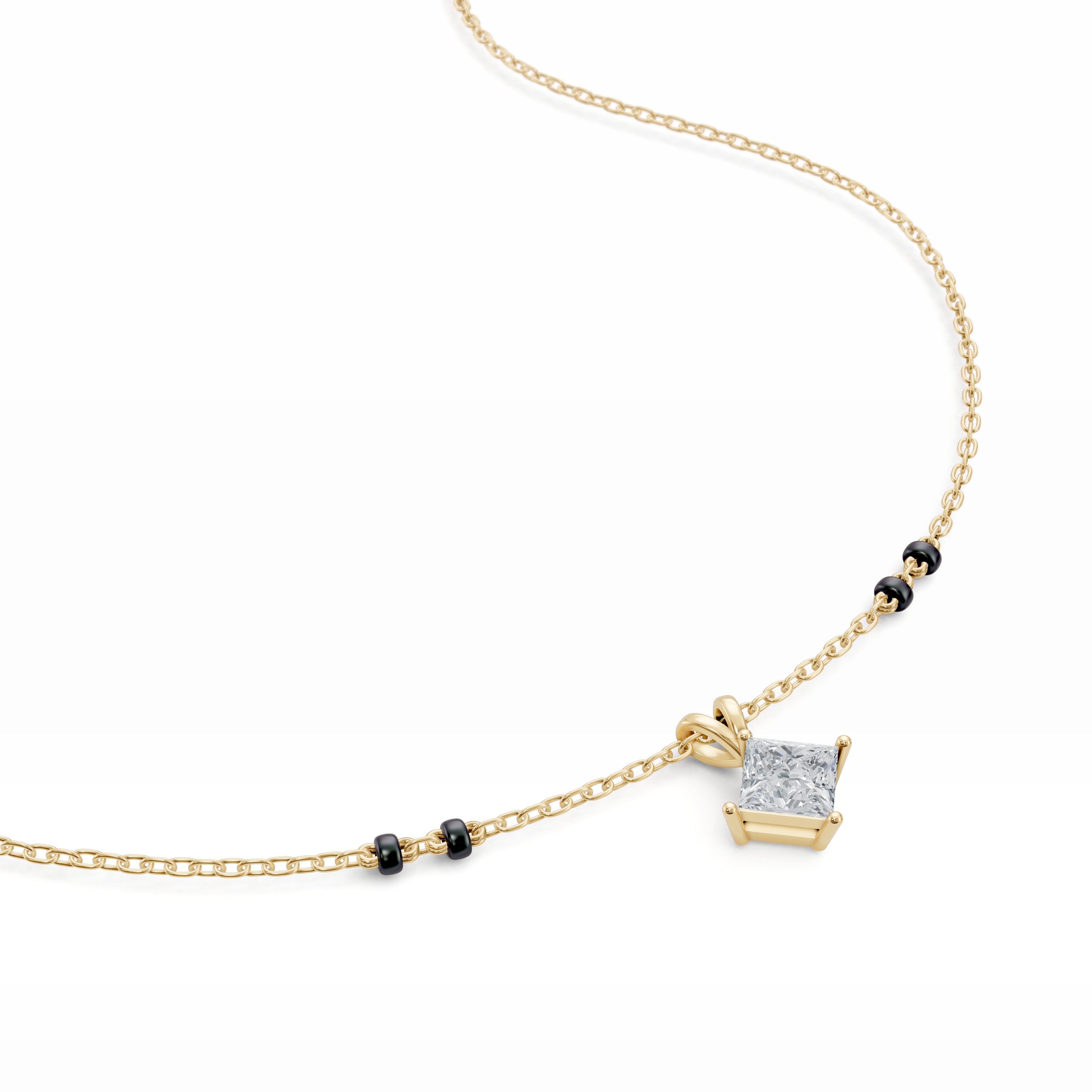 Discover the Zara Mangalsutra—where classic charm collides with modern edge. Featuring a diagonally set princess-cut certified lab-grown diamond, ranging in diamond size and grade options, this piece radiates sophistication from its sleek bail pendant.