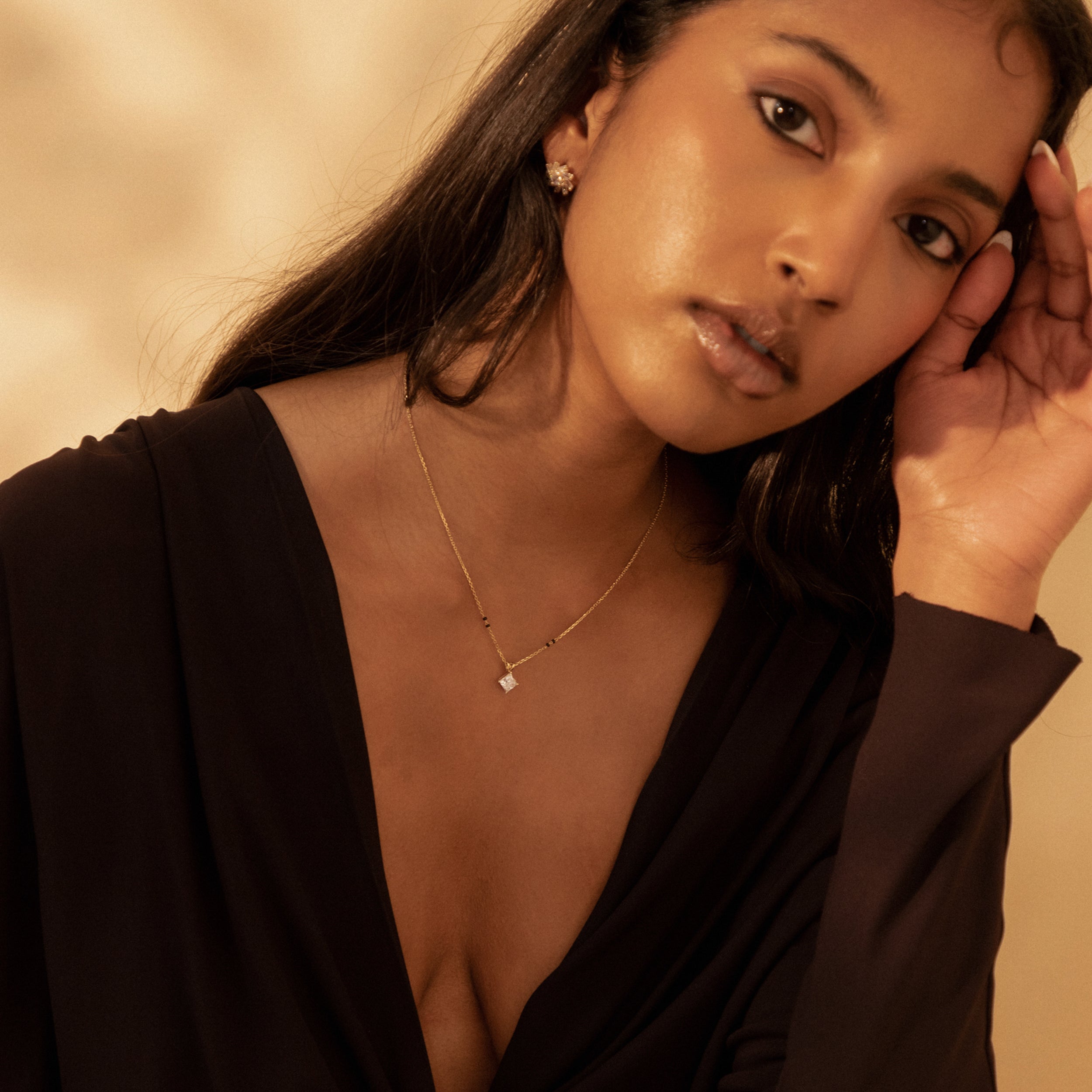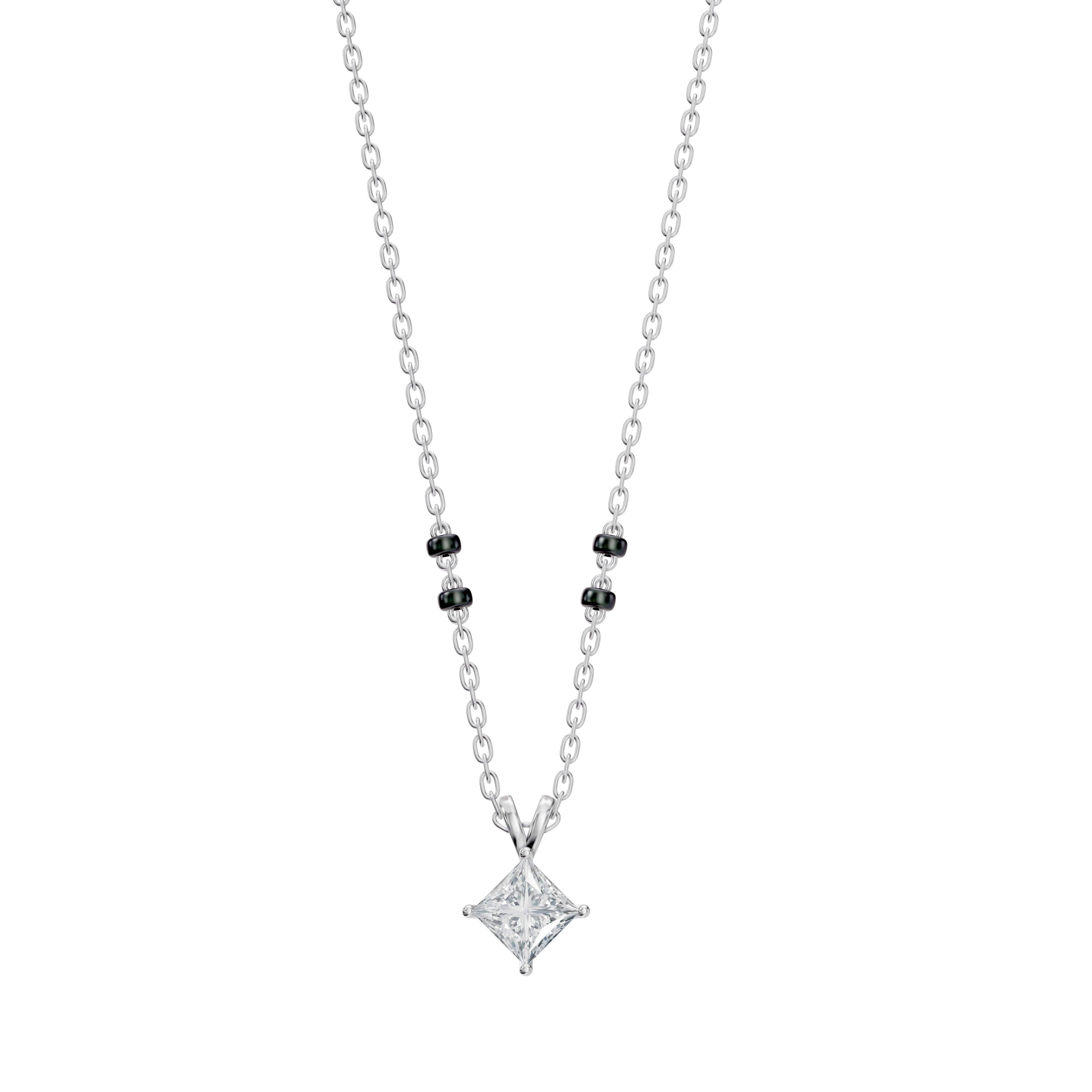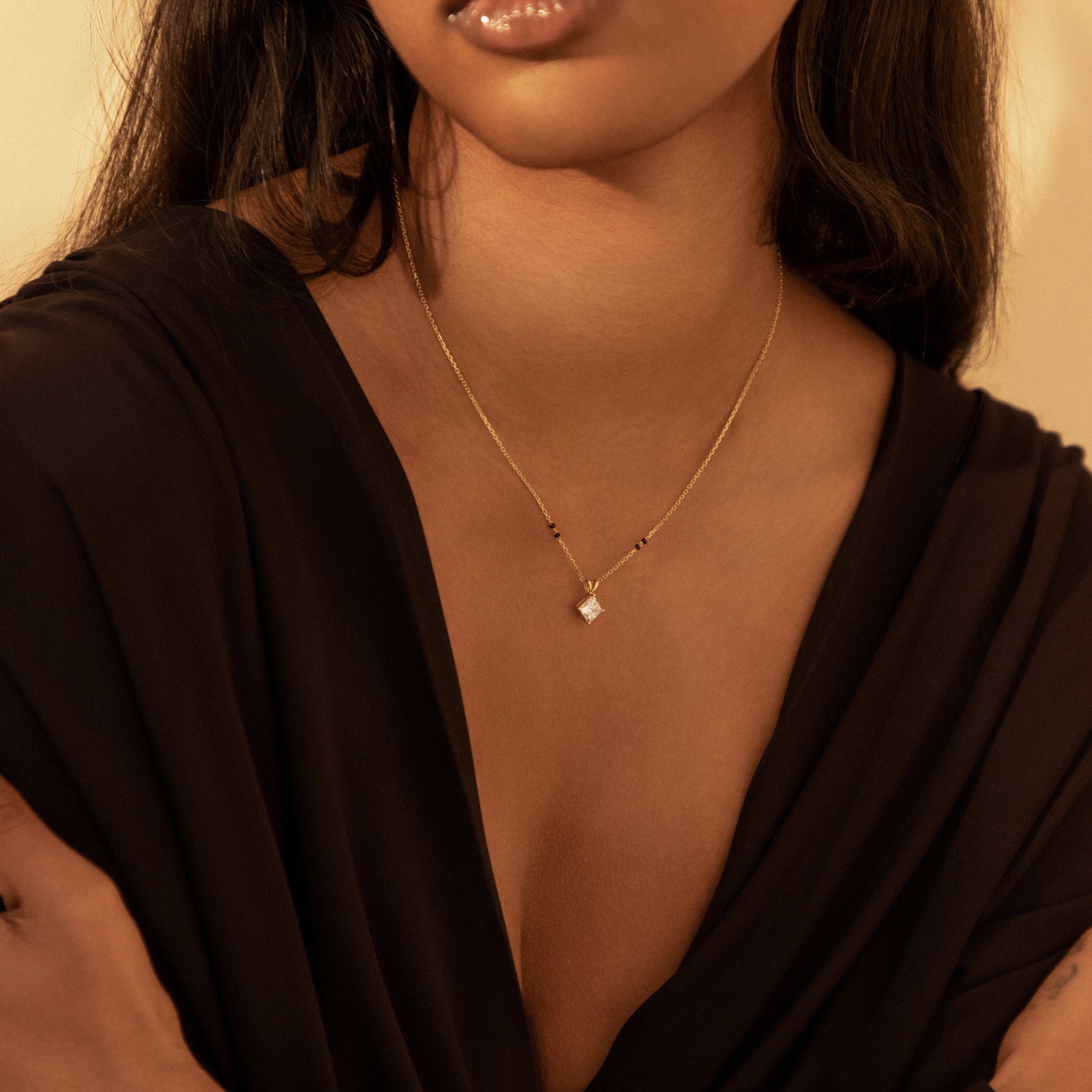 Discover the Zara Mangalsutra—where classic charm collides with modern edge. Featuring a diagonally set princess-cut certified lab-grown diamond, ranging in diamond size and grade options, this piece radiates sophistication from its sleek bail pendant.