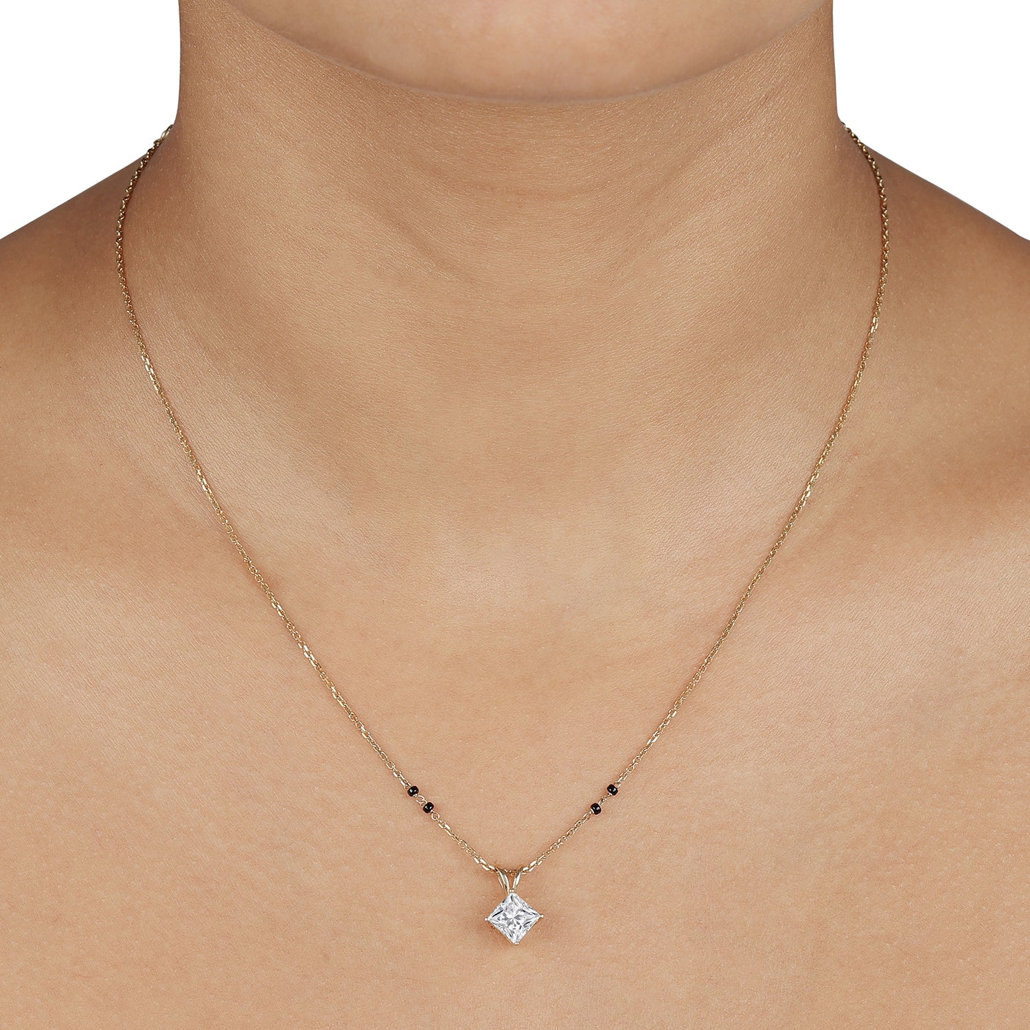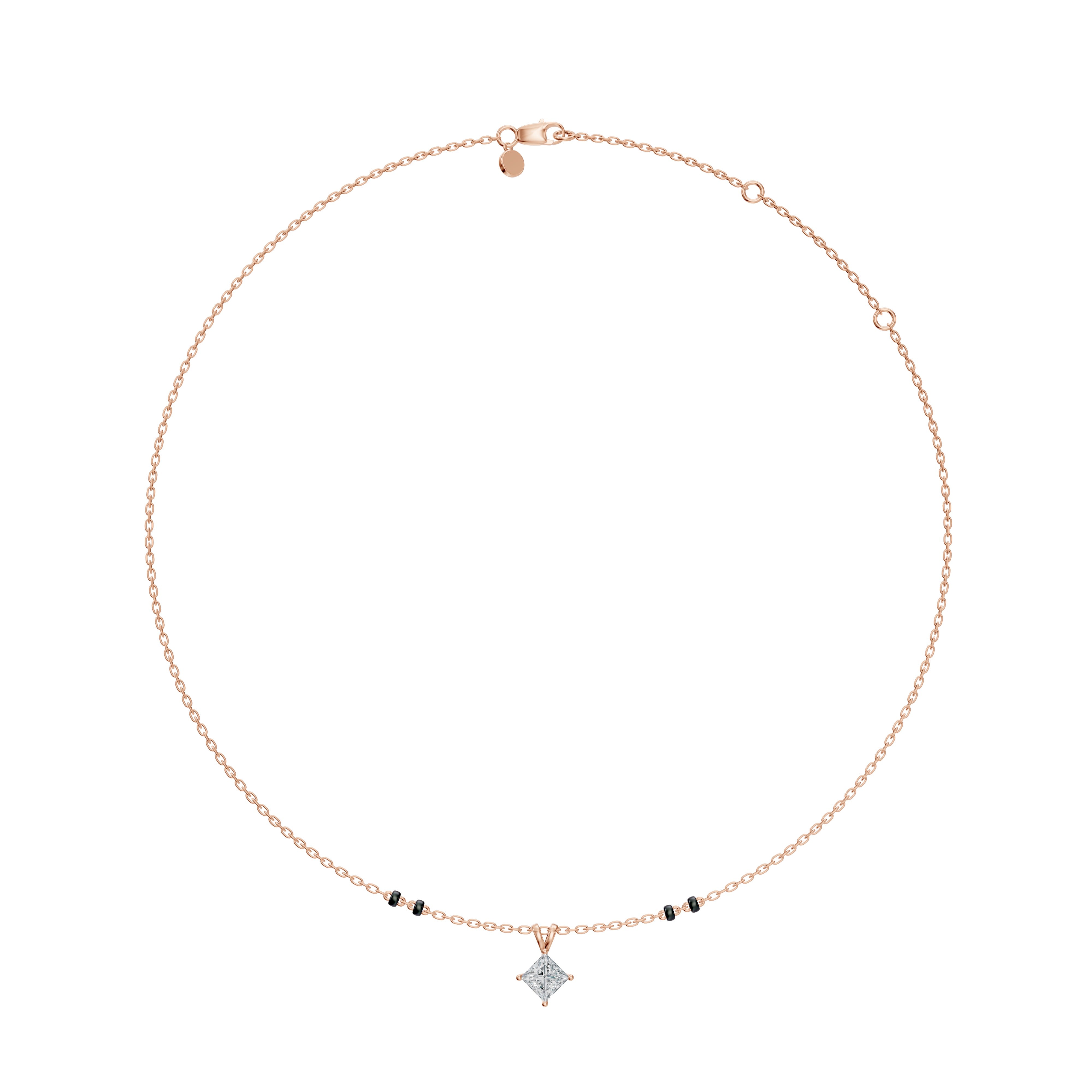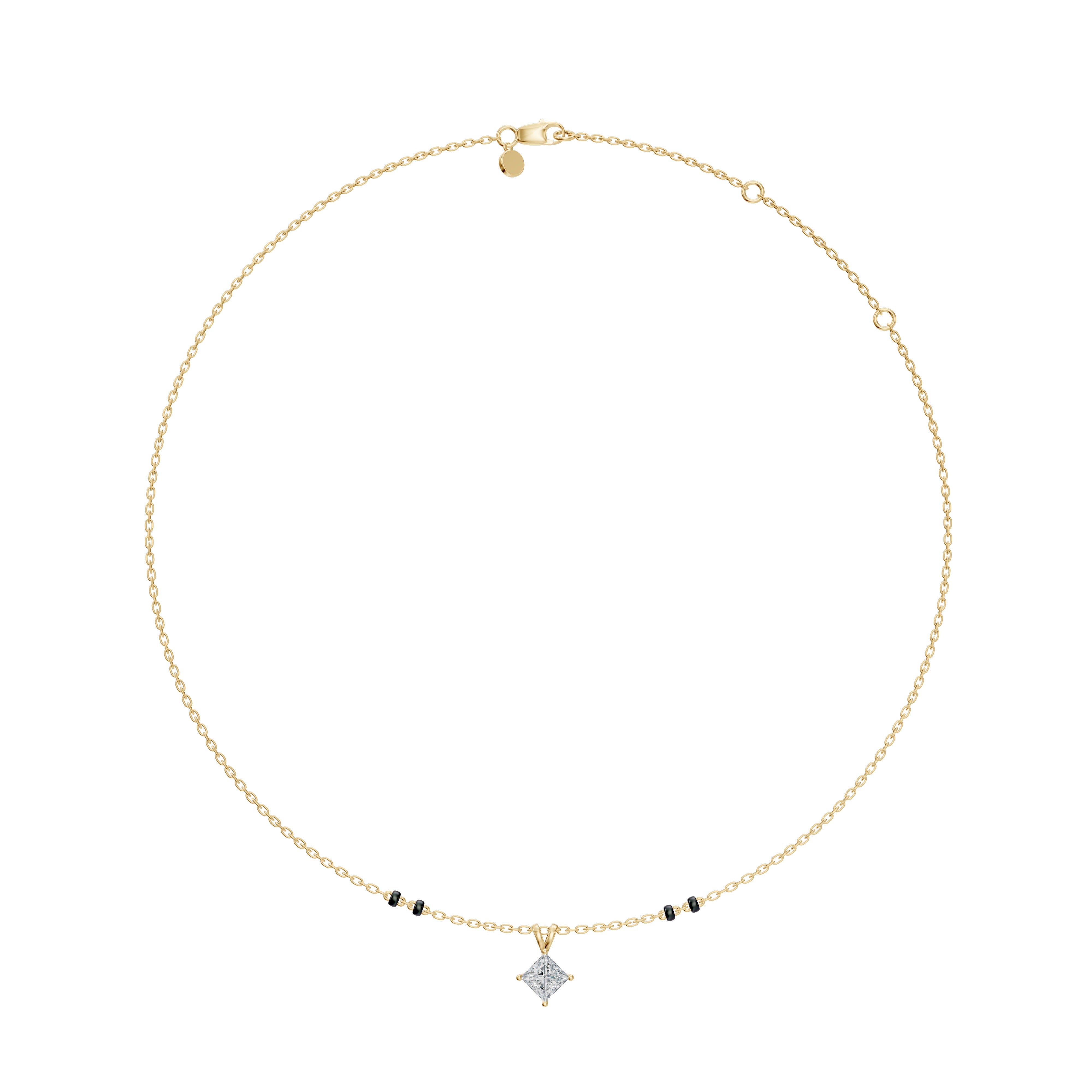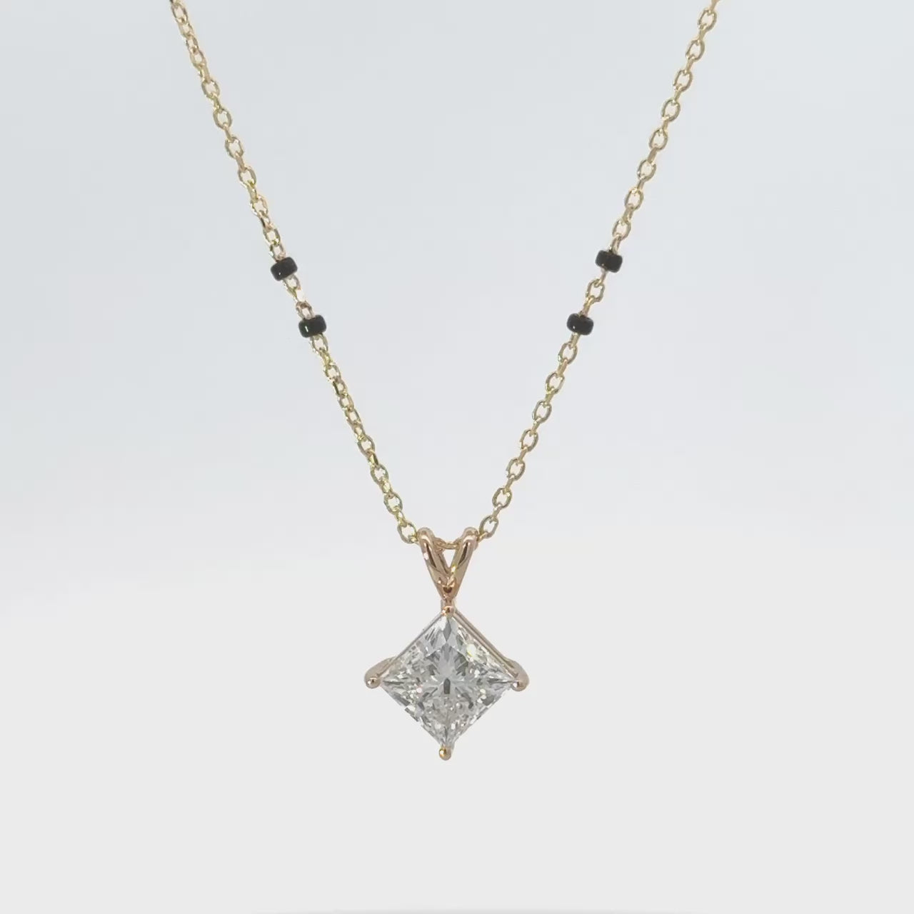 Discover the Zara Mangalsutra—where classic charm collides with modern edge. Featuring a diagonally set princess-cut certified lab-grown diamond, ranging in diamond size and grade options, this piece radiates sophistication from its sleek bail pendant.